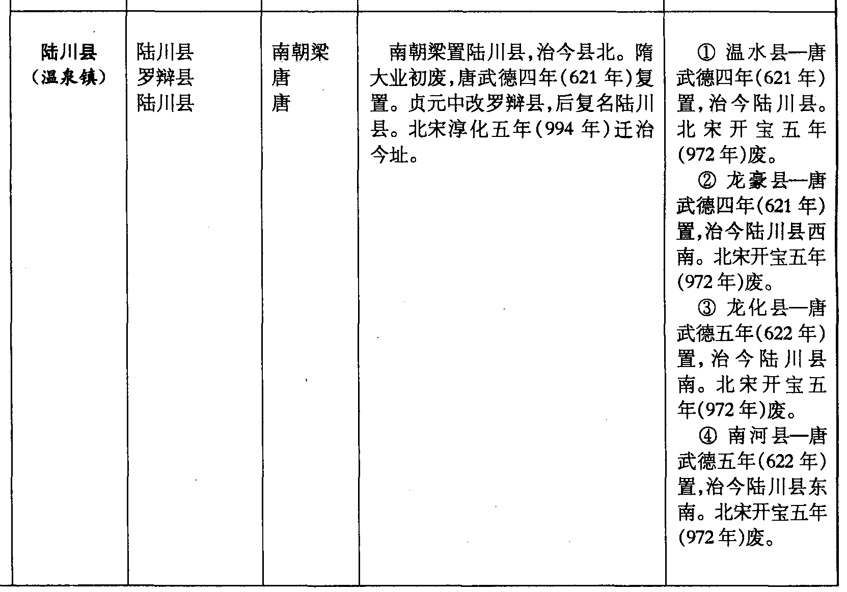 陆川县(温泉镇)陆川县罗辩县陆川县南朝梁唐唐南朝梁置陆川县,治今县北。隋大业初废,唐武德四年(621年)复置。贞元中改罗辩县,后复名陆川县。北宋淳化五年(994年)迁治今址。❶ 温水县—唐武德四年(621年)置,治今陆川县。北宋开宝五年(972年)废。❷ 龙豪县—唐武德四年(621年)置,治今陆川县西南。北宋开宝五年(972年)废。❸ 龙化县—唐武德五年(622年)置,治今陆川县南。北宋开宝五年(972年)废。❹ 南河县—唐武德五年(622年)置,治今陆川县东南。北宋开宝五年(972年)废。