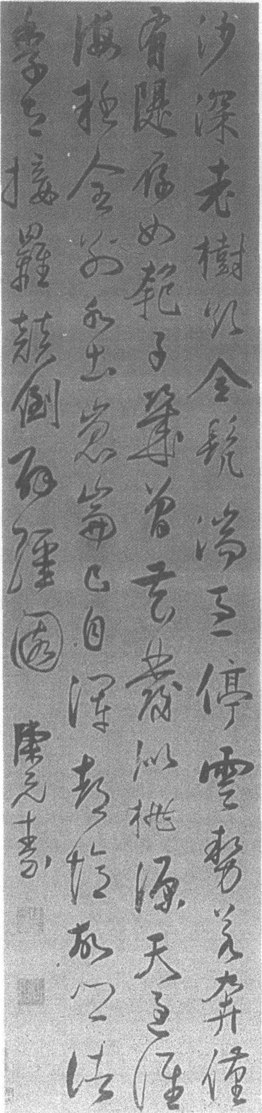 释义 | 陈元素行书七言律诗轴 陈元素行书七言律诗轴明。纸本。纵132.5厘米,横32厘米。上海博物馆藏。陈元素(见《陈元素草书五言律诗轴》条目)书。七言律诗:“沙深老树欲全髡,湍急停云势若奔。仅有隄存如匏子,几曾花发似桃源。天过淮海疑全别,水出昆仑已自浑。都忆故乡诸季在,接䍠颠倒辟强园。”款署“陈元素”。款下钤白文<陈元素印>、<古白>两印。行书得欧阳询之笔意,行草相间,笔画圆转遒美,内含筋骨,有秀逸姿媚之风格。 ☚ 米万钟行草书七言律诗轴 傅山草书诗轴 ☛ |