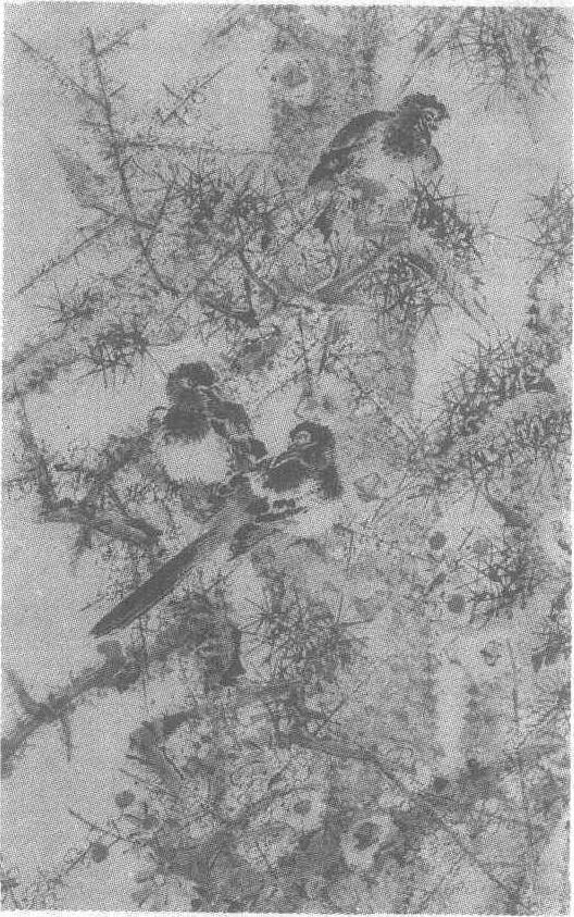 清康熙九年(公元1670年)。陈嘉言绘。纸本设色。纵167厘米,横42.6厘米。上海博物馆藏。陈嘉言(公元1599—?年),字孔彰,浙江嘉兴人。他善写花鸟,运笔苍老自然,设色清丽,韵格兼胜,传世作品有《水仙梅雀图轴》、《梨花斑鸠图轴》、《松鼠葡萄扇页》及《野庭秋色扇页》等。此图描绘的是春暖花开,万物复苏时的动人一幕:绿茵茵的平坡兀石旁,两株巨松拔地而起,一高高耸立,一斜向画外。梅枝缀满怒绽的白花、含苞欲放的红蕾纵横交错,穿插在浓密墨绿的松针间。三只喜鹊栖立枝头,一只俯视前方,两只首尾相背地依偎在一起,喃喃细语。树下白、褐两只兔子斜对趴伏着,安静地咀嚼青草,尽情地享受着融融春光。轻柔的白云悠悠地浮过树梢,飘向远方。画的右上角有署款“仿元人笔意,七十二叟陈嘉言写。”下钤白文〈陈嘉言印〉、朱文〈孔彰〉两方印。此图集传统功力与独创于一体,布局平稳空灵,用笔苍劲老辣,墨色滋润。松柏劲健挺拔,梅花娇娆多姿,喜鹊毛绒可爱,双免宁和宜人。整个画面洋溢着浓郁的吉祥、平和、生机盎然的气氛,抒情性很强。