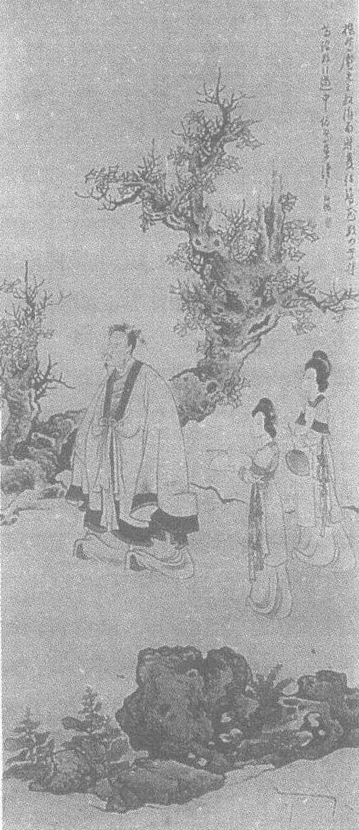 明。陈洪绶(见《陈洪绶女仙图轴》条目)绘。绢本淡设色。北京故宫博物院藏。此幅描绘了杨慎男扮女妆,招摇过市的情景。杨慎(公元1488—1559年),字用修,号升庵,四川新都人,是明代最博学、最富于著述的学者,曾被授翰林修撰。嘉靖三年(公元1524年)因议大礼,跪门哭谏获罪,被谪云南永昌卫,直至病逝。30余年的放逐生活使得这位失意文人在无望的岁月里,放荡形骸,玩世不恭,作出“胡粉傅面,作双丫髻,插花,门生舁之,诸伎捧觞,游行城市,了不为怍”(见王世贞《艺苑卮言》)的怪诞之举,对此众议不一,有反感的,有同情的,也有欣赏的。陈洪绶就是持赞赏态度描绘此图的。图中大腹便便的杨慎满头插着鲜艳的花枝,身着宽大的滚边阔袖袍,正昂首鼓腹,凝视前方,走过一株虬枝苍老的红枫古树。两个捧盂、持扇的窈窕侍女紧随其后,惶惶地注视着主人。近处有零落的山石和野花。图的右上角有题识“杨升庵先生放滇时,双髻簪花,数女子持尊,踏歌行道中,似为小景识之,洪绶。”下有二方印。