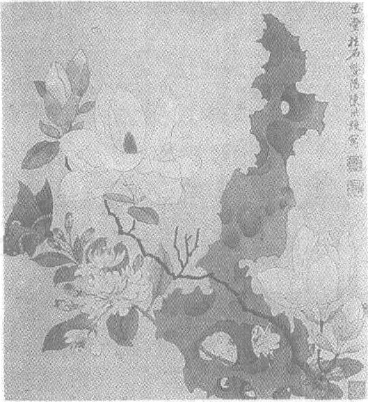 释义 | 陈洪绶杂画册 陈洪绶杂画册明。陈洪绶(见《陈洪绶女仙图轴》条目)绘。绢本设色。纵30.2厘米,横25.1厘米。北京故宫博物院藏。此册作山水、人物、花卉等计八开。其一为设色花石:秀逸的湖石前后分傍一枝玉兰和一枝海棠。洁白的玉兰、粉红的海棠交相辉映,别具雅韵,仿佛散发着淡淡的清香。一只美丽的蝴蝶,扑闪着五彩斑斓的翅膀,轻盈地落在海棠绿叶上。图的右上角有题识“玉堂柱石,暨阳陈洪绶写。”下钤白文〈陈洪绶印〉、朱文〈章侯〉二方印。此外图上还有〈芝农秘玩〉等鉴藏印18方。其二为设色罗汉:坡石上,坐着一位额头高凸、络腮胡须满脸的罗汉,他怀抱手杖,正瞪大眼望着双手合十跪于其前、满头金色卷发的人。图的左上边有自题“无法可说,洪绶法名僧悔。”其旁有〈洪绶〉珠文联珠印。其三为设色石泉云树:矶石垒垒,芳草萋萋,流水跌荡,古树苍郁,洁白的浮云宛如玉带般横挂在远岫山腰、林木梢际。图的左下角有自题“老迟洪绶仿赵千里笔法”,下钤〈陈洪绶印〉。其四为设色黄河浪涛:一泻而下的黄河,汹涌澎湃,浊浪滚滚,咆哮着奔向远方。几叶扁舟随波逐流,漂荡在黄涛之间。河的两岸天低云黯,草木瑟瑟。图的右下角有自题:“黄河巨津,老迟洪绶。”下钤〈陈洪绶印〉。其五为设色仕女:一位手持纨扇的仕女,若有所思地走在前面,另有两位侍女手捧针线托盘和丝绣衣袍紧随其后,边走边轻声交谈。图的右上角有题识:“夔龙补衮图,陈洪绶书于静香居。”钤〈陈洪绶印〉、〈章侯〉二方印。其六为设色溪涧石桥:重峦叠嶂,气势雄浑的远山间,如流的瀑布蜿蜒地沿着山势倾下,汇入布满矶石的溪间,石桥上面相对坐着二人。图的右上角题:“溪石图,洪绶。”下钤〈陈洪绶〉、〈章侯〉二方印。其七为设色江渚归帆:暮色苍茫,晚风初起,在水上忙碌了一天的人们,在浅吟低唱的芦荻相伴下,落帆收缆,正慢慢地向港湾靠拢。掩映在茂密的树丛中的村落及远山披上了一层淡淡的轻雾。图的右上角有自题:“远浦归帆,仿赵大年笔意,老莲洪绶”,下钤“章侯”印。其八为设色湖山:近处江水浩渺,碧波荡漾。远处山岭逶迤,连绵起伏,洁白的小花,星星点点开满山崖。青山绿水间洋溢着浓浓的生机。图的左上角有题款“仿李唐笔意,洪绶。”下钤〈章侯〉印。此册画法工整,趣味古拙,设色浓淡相宜。山水、人物、花卉各具特色,无不精妙,堪称陈氏的佳作。 ☚ 陈洪绶升庵簪花图轴 张翀瑶池仙剧图轴 ☛ |