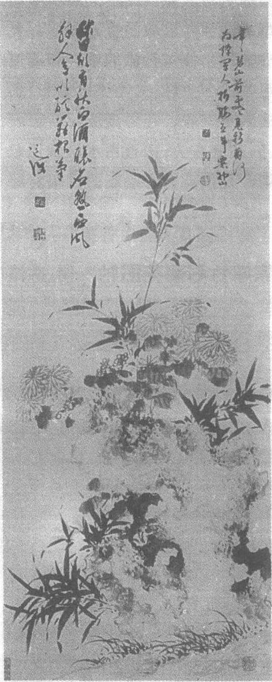 释义 | 陈淳竹石菊花图轴 陈淳竹石菊花图轴明。陈淳绘。纸本墨笔。纵115.8厘米,横46厘米。上海博物馆藏。陈淳(公元1483—1544年),字道复,后以字行,更字复甫,号白阳山人,江苏苏州人。天资聪颖,对于经学、古诗文词及书法、绘画都有相当造诣。少年时,曾从文徵明学书画,早年山水画风精细,但很快脱出老师的规范,随意点染。中年醉心于米友仁、高克恭,侧重写意,笔墨更为放纵酣肆,山水淋漓,极高远之致。陈淳在花鸟画方面成就突出。他和徐渭在画史上并称“白阳青藤”,被推许为建立水墨大写意花卉画的两位大家。写意花卉,多用淡墨浅色,清秀疏爽,奔放纵逸,意趣盎然,对后世影响很大。为明代写意花鸟画大师。著《白杨集》。此图绘太湖石,用飞白笔法,皴法松秀,略施淡墨渲染,显得玲珑秀巧。石后绘三竿墨竹,风采各异,布局巧妙。湖石顶端,攒簇着盛开的菊花,淡花浓叶,墨色浓淡结合,神采生动。构图紧凑,意趣盎然,表现出浓浓的秋意。用笔生动,画面开朗,随意点染,涉笔成趣。此图深受元人水墨写意的影响,是陈淳的代表作品。左上自题五言诗一首,款署“道复”,下钤<白阳山人>、<陈氏道复>白文印,押角有<大姚>朱文圆印。右上有明王问的题诗。此图曾由近人顾麟士收藏。 ☚ 仇英剑阁图轴 陈淳山茶水仙图轴 ☛ |