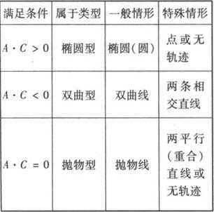 释义 | 利用移轴化简缺xy项的二元二次方程 设二次曲线的一般方程为Ax2+Cy2+Dx+Ey+F=0(A、C不同时为0),则可通过下述方法化简: 1.代入法 将平移公式代入已知方程F(x,y)=0,适当选取h,k的值,可使新方程不含一次项(或只有一个一次项而没有常数项),此时方程化为标准方程. 2.配方法 将已知方程的二次项配成完全平方后,再选取适当的h,k的值,将方程化简. 方程Ax2+Cy2+Dx+Ey+F=0(A、C不同时为0),通过平移化简结果如下表 |
