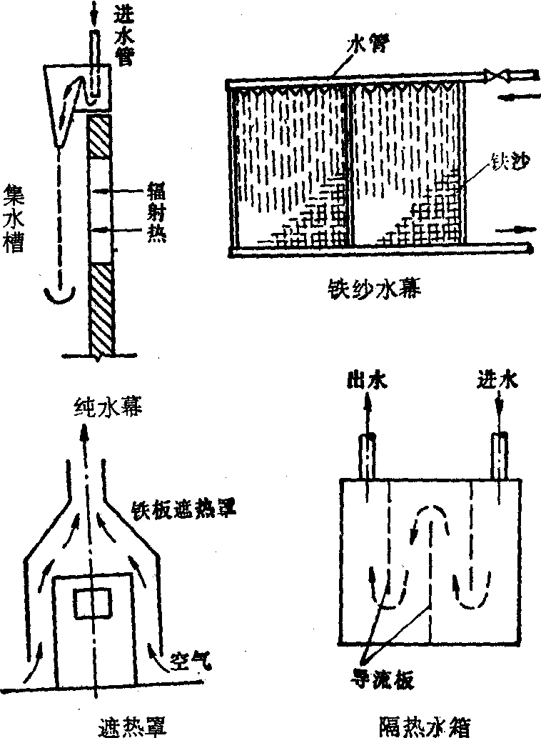 另见:景象1 环境 情景 严肃 活泼 ☚ 气氛 各种气氛 ☛ 降温 降温利用隔绝热源、机械通风或自然通风及空调设备等综合技术措施,使室内气温下降,人体热感减弱,称为降温。高温工作场所采取的降温措施主要有下列几个方面: (1) 控制热源散热:首先尽量减少生产场所的热源,其次用隔热材料或措施将热源同工人经常活动的地点隔离开,以减少工人受强辐射热作用和降低工作地点的气温。例如,在炎热地区对屋顶采取加厚隔热层,设通风隔层和屋面喷淋水措施,对发热设备(如热管道、加热炉)用隔热材料包裹和屏挡起来,此外隔热水箱、铁纱水幕、纯水幕、遮热罩等也是几种行之有效的方法,见图。