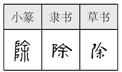 【提示】阝 ,2画,起笔是横撇弯钩; 旧字形3画,起笔是横撇。余,第六笔宋体是撇,楷体是撇点。 *除chú9画 阜部 (1) 〈书〉阶梯: 阶~|庭~。 (2) 〈书〉任命;授予(官职): ~授。 (3) 去掉: ~尘|~根|铲~|为民~害。 (4) 数学计算方法之一。用一个数把另一个数分为若干等份: ~法。 (5) 不计算在内: ~非|~了|~此而外。 除 ☚ 陶 階 ☛ 除chú春秋时形声字。从阝(阜),余声。古音声母从舌尖音分化出零声母、翘舌音等。如余声的涂就保持舌尖音声母,又如汤的声旁有扬、觞等。“除”本指宫殿的台阶。如:庭除|堂除。引申为去掉。如:除害|斩草除根。又指不计算在内。如:除此以外|除了他。可组词如:除去|除非|除夕。又指算术中用一个数去分另一数。如:用二除四得二。 除★常◎常