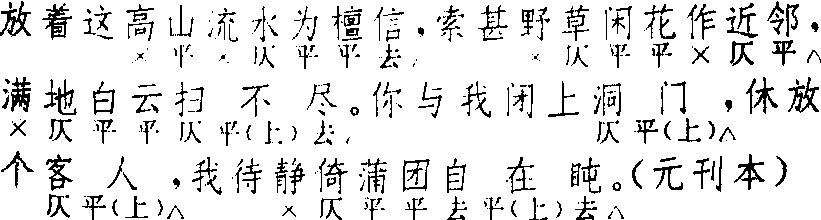 释义 | 隔尾 隔尾马致远 《陈抟高卧》 ![]() 全曲六句:7△,7△,7△。2△,2△,7△。首二句对。第三句单行。第四、五句,多在二字上加衬,作四字或五字句,很少作二字者;长句如汪元亨“新栽数亩瓜”套:“折莫你赵平原诱英雄计谋,齐孟尝待贤良肚腹。”偶有合为四字一句者,如关汉卿《赠朱帘秀》套“煞是可怜”。此为〔南吕〕套尾声正格。〔南吕〕短套只须〔一枝花〕、〔梁州第七〕及〔尾声〕三曲即可;如作长套,即在此尾后再联用他曲,故称〔隔尾〕。作尾声时,须直题〔尾声〕或〔尾〕,不再题〔隔尾〕,因已失去“隔”的作用。联入套中,可用二至三支,唯须间以他曲,以示有所隔。李寿卿《度柳翠》,〔隔尾〕连用〔幺篇〕,实为仅见。作尾声用,可增句,见后。 ☚ 梁州第七 牧羊关 ☛ 隔尾 隔尾曲牌名。属北曲南吕宫。近人吴梅《南北词简谱》:“此实南吕尾正格,所以云‘隔尾’者,盖用此尾后,尚连接他曲,故云‘隔’;若此后别无他曲,便直书 〔尾声〕矣。”该调之字数定格及韵式,据清·周祥钰《九宫大成谱》作七、七、七、二、二、七 (六句)。在南吕宫中,除用作〔尾声〕外,还可用于套曲中间,接在 〔梁州第七〕 曲牌之后。又该调偶有书作〔余音〕、〔随煞〕者,要根据情况作具体分析判断。 ☚ 梁州第七 一江风 ☛ |