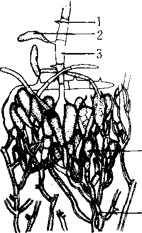 释义 | 隔担菌属Septobasidium担子菌亚门,隔担菌目。担子果蜡质至壳质,平伏呈膏药状或海绵状,多生在介壳虫体上。下担子壁厚,卵形或近球形;上担子圆筒形,直或弯曲,有横隔膜3个分成4胞,每胞生一小梗,担孢子单个顶生,担孢子单胞,多椭圆形,无色,平滑,成熟时常生出横隔膜。常见的有茂物隔担菌(S.bogoriense Pat.),引致李属多种果树、桑、茶等植物的膏药病,柑橘生隔担耳(S.citricolum Saw.),引致柑橘属植物的膏药病。 隔担菌属 1.小梗 2.担孢子3. 上担子 4. 下担子 5. 菌丝 |