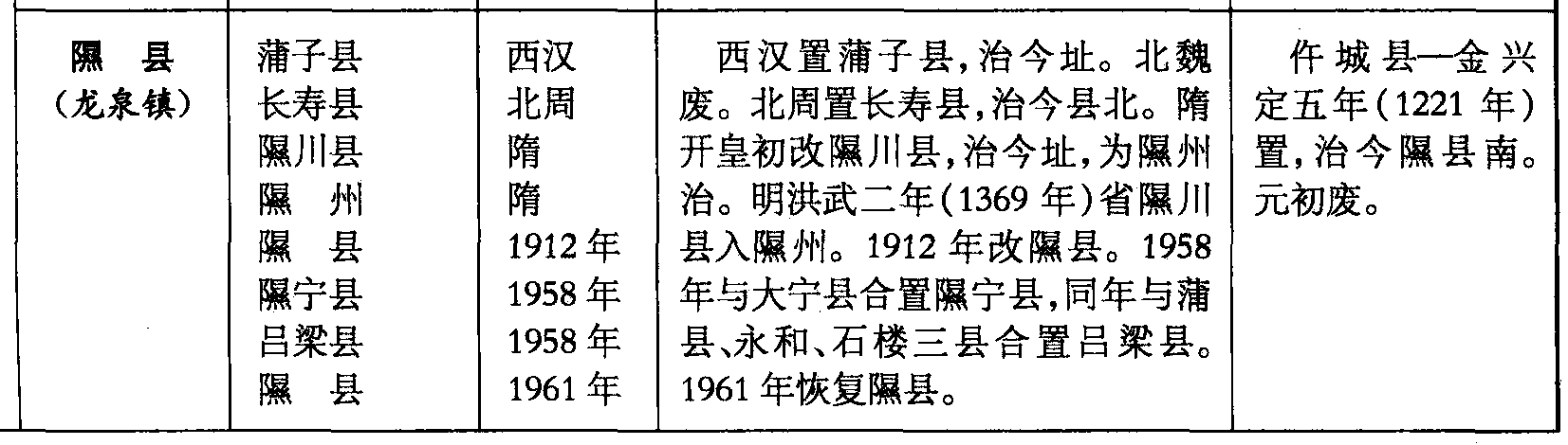 西汉置蒲子县,治今址。北魏废。北周置长寿县,治今县北。隋开皇初改隰川县,治今址,为隰州治。明洪武二年(1369年)省隰川县入隰州。1912年改隰县。1958年与大宁县合置隰宁县,同年与蒲县、永和、石楼三县合置吕梁县。1961年恢复隰县。