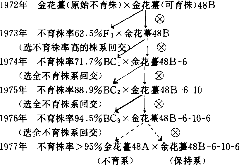 释义 | 雄性不育系male sterile line通过人工选择育成雄性不育性稳定而雌性机能完全正常的植物亲本系统。两性花植物由于遗传原因造成雄性机能丧失的现象称雄性不育。雄性不育可分为雄蕊退化、花粉败育、功能不育三种类型。利用雄性不育系配制一代杂种,只要将不育系和可育的父本种植在同一隔离区内,从不育系植株上采收的种子全部为杂交种。 图 1 金花薹萝卜不育系48A和保持系48B的选育过程 如果用上述广泛测交、回交方法仍无法获得保持系,则应采用人工合成保持系的方法,即用不育株作母本,用几个优良可育材料作父本进行杂交,并将父本进行自交。第二代选择没有育性分离的F1作父本,以原父本为母本去雄进行反回交。第三代在BC1中选出4~5株作父本用原不育株作母本进行测交,父本同时自交。第四代选择育性分离组合,从相应父本中至少选出10株进行测交和自交。如果每个分离世代保持足够的群体,第五代在各测交后代中即可选出不育株率为100%的组合,即为不育系,其测交父本即为保持系。 对于核型雄性不育材料,当获得原始不育单株后先用同系或同品种材料进行测交。测交第一代有可能出现育性分离,也可能全部恢复育性。如F1恢复育性,则进行自交;如F1出现育性分离,则用不育株作母本,用系内可育株作父本进行姊妹交。测交组合数应大于4个,每一组合后代观察数应大于10株。以后各世代均按上述方式进行处理。连续两代出现育性分离,选育即告成功。连续两代不出现育性分离的组合应予以淘 图2 大白菜2184核型雄性不育系的选育过程 核质互作型不育材料的转育,如转育亲本对此不育系有保持能力,则需连续回交6~8代即可;如转育亲本无保持能力,则需对不育系及保持系同时进行回交转育。第一代以原保持系为母本与轮回亲本杂交。第二代用它们的后代作父本与不育系匹配,同时用它作母本与轮回亲本回交。第三代不育系后代会出现1:1育性分离,选出其中的不育株,再与保持系回交一代中至少5个单株分别进行杂交,同时将这些单株与轮回亲本进行第二次回交。第四代选择不育系后代中的不育单株与相应匹配父本的后代中5个以上单株进行杂交,同时将这些单株分别与轮回亲本回交。以后各代均以此方式匹配。待回交5~6代即可同时获得新雄性不育系与相应的保持系。此外,也可采用人工合成保持系的方法对无保持力的转育亲本进行改造。但在选育过程中必须按转育系的性状要求加强对经济性状的选择。 利用核质互作型雄性不育系生产一代杂种的蔬菜作物有洋葱、胡萝卜、萝卜、辣椒等。多数学者研究认为,洋葱不育系核内由一对隐性基因控制。其他作物不育性遗传较复杂,胡萝卜、萝卜、辣椒的一些不育系,核内受两对隐性基因控制。由于蔬菜作物大多不以种子为产品,利用核质互作型雄性不育系生产一代杂种不需要恢复系,只需要不育系、保持系和与其有良好特殊配合力的父本系即可。 可利用核型雄性不育系生产一代杂种的蔬菜作物有白菜、番茄等。研究证明,目前使用的白菜、番茄不育系大多为一对隐性基因所控制。此外白菜、结球甘蓝、芥菜等已获得核质互作型不育材料,结球甘蓝也获得了核型不育材料,但都未用于制种。 雄性不育系male sterility line简称不育系。具有可遗传的雄性不育性的植物品系。配制杂交种时,以不育系作母本,可简化去雄手术,便于杂种优势的利用。 雄性不育系简称“不育系”。具有雄蕊不育而雌蕊正常的遗传性状的作物品系。用作母本,为异花授粉作物的杂种优势利用省去去雄工作,也为自花授粉作物的杂种优势利用开辟了新途径。 |