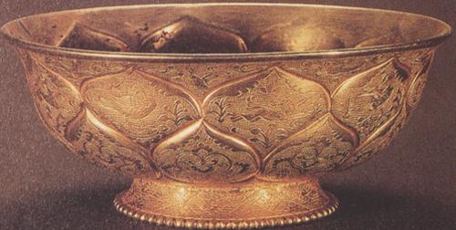 释义 | 刻花赤金碗 ◎餐具/唐 1970年10月陕西西安南郊何家村唐窖藏出土 高5.5厘米 口径13.7厘米 足径6.7厘米 金/陕西省博物馆藏 ●此碗敞口,圆唇,圆鼓腹,喇叭形圈足。 碗外壁浮雕相互交错的两层莲花瓣状纹饰,每层十瓣,上层各瓣内分别刻有獐、鹿、孔雀、鸳鸯等瑞兽奇禽。下层花瓣内均饰以忍冬如意花纹。双层莲瓣及各种禽兽之间均以花草纹填充。圈足外壁錾刻菱形小花,足底外翻并刻有一圈联珠纹。 碗内侧有墨书“九两半”三个字。 刻花赤金碗多为帝王所用,碗中墨书标出它的含金量,为唐代管理金银器之法。此碗以同形莲瓣上下交错随形而饰,整体极具节奏感。金碗莲瓣均作凸起球面状,形体饱满。 通体以鱼子纹为地,莲瓣之内和瑞兽奇禽四周以花草纹衬托其形.主次清晰,疏密适宜。 大敞口、圆腹及喇叭形圈足形成的开敞与精致的纹饰相映成趣,构成既庄严又华贵的品格。 |