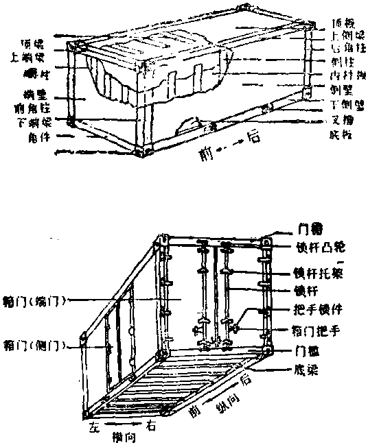 释义 | 集装箱结构 集装箱结构常用的通用集装箱结构,是一个长方形的六面箱体,由一个箱底、两个侧壁、一个端壁、一对箱门和一个箱顶组成。在四根垂直角柱上下均装有装卸时起吊和运输时固定箱体用的角件(如图示)。其他各类型的集装箱结构,根据其各自的特点需要出发,在通用集装箱基本结构基础上演化而成。