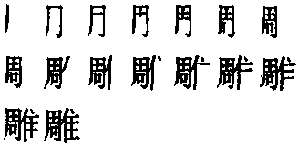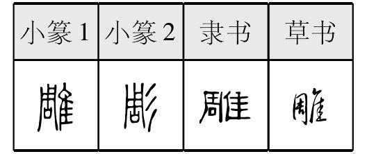 【提示】在异体字整理前,表示 “雕属各种鸟的名称(如老雕)” 时,“雕” 的异体是 “鵰”; 表示 “雕刻”的意思时,“雕” 的异体是“彫” 和 “琱”。周,起笔是竖撇,不是竖; 中间是土,不要错写成士; 旧字形中间一竖与第二个横相交,下面出头。隹,右边起笔是侧点,旧字形是撇点; 右边有四横,不要错写成三横或圭。 *雕1〔鵰〕diāo16画 隹部 猛禽。嘴呈钩状,视力很强,腿部有羽毛。也叫鹫: 老~|一箭双~。