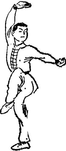 支撑腿直立或微屈站稳,上体正直。另一腿在体前屈膝高提近胸,小腿斜垂里扣,脚面绷平内收。实战中多用于防护裆部用,也有开门势之用,是防守动作。