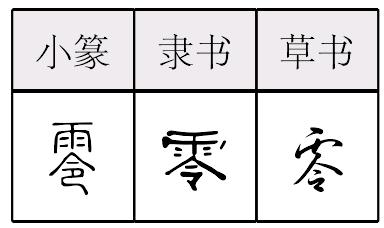 【提示】雨,位于字上时,中间四点宋体改四短横,楷体不变。令,第三笔是侧点,旧字形是横; 第四笔是横撇,旧字形是横折钩;第五笔是侧点,旧字形是竖。 *零líng13画 雨部 (1) 〈书〉(雨、泪等)落下: 涕~。 (2) (草木花叶)因枯萎落下: ~落|凋~。 (3) 散碎的;小部分的(与“整”相对): ~钱|~售|~用|~七八碎。 (4) 数词。 1. 表示没有数量;无: 一减一等于~|从~开始|这种药的效力等于~。 2. 数的空位,在数码中多写作“○”: 四~五号|两千~一年。 3. (~儿)不成整数;余数: 挂~儿|一年~一个月。 (5) 温度表上的冰点: ~下10度。 零 ☚ � 霖 ☛ 零líng甲骨文本来是会意字。象雨下滴三点,零星小雨义,西周后讹从三口。小篆以后另造形声字。从雨,令声。本指徐徐而下的雨,即细雨。现代说零星小雨。引申为零头,放在整数后表示有零头。如:零数|一年零三天。再引申为部分的,细碎的。如:零件|零钱|零活。组词如:零碎|零丁(现常作伶仃。如:孤苦伶仃)。数学上把数字符号“0”读作零。引申为没有,无。如:他的计划等于零。又指温度表上的零度。如:零下5度。古汉语引申转为落义。组词如:零落|凋零。又指液体降落。如:感激涕零。 零★常◎常