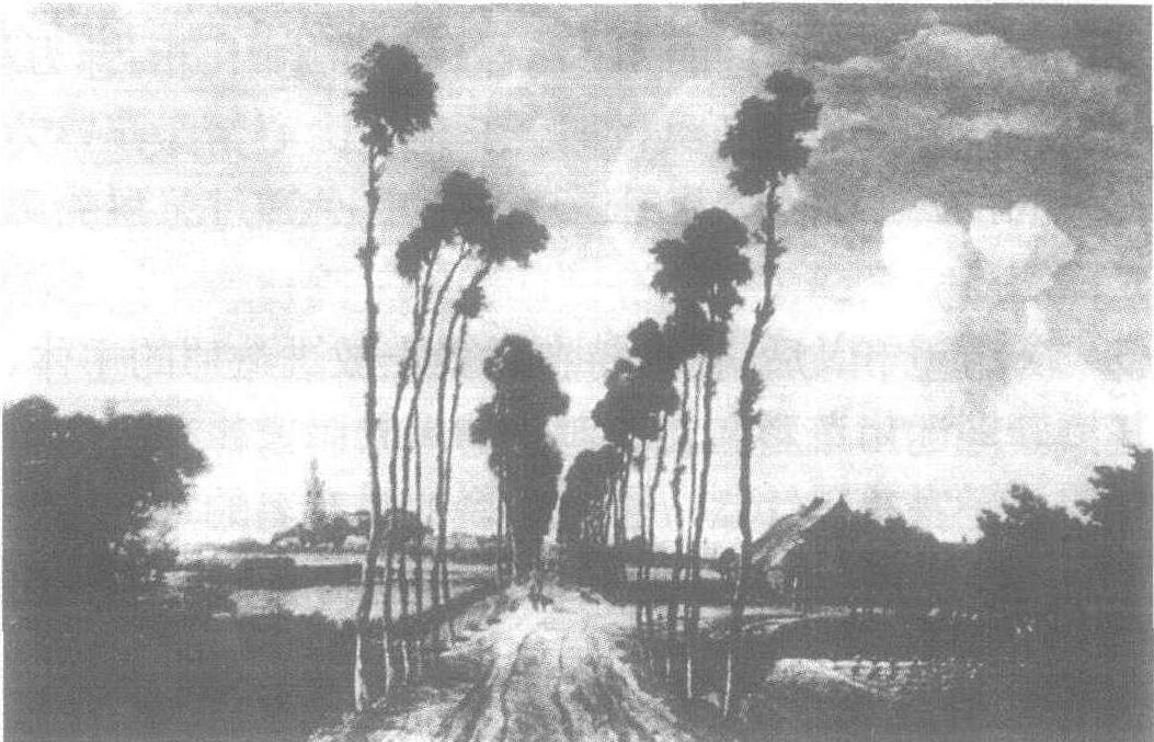 在1650年以后,仍坚持在近景上放进造形的主体,并巧妙地运用色彩和光的对比的风景画家,有雷斯达尔的弟子霍贝玛(1638—1709)。他在有名的《树间村道》中,描绘了一条狭长的路和两侧并排的树木伸向很远的远方,人和房子都服从于越远越小,最后消失于地平线上的图法原理。在色彩上,从前景的暖色向远景的冷色渐渐过渡,是根据典型的空气透视法画成。总之,这幅画的细部是写实的,而在整体构思上又带有很强的幻想性,可以说是一幅秀丽而轻快的独特风景画吧。