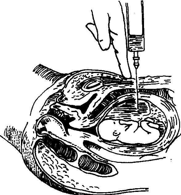 人工终止中期妊娠的手术叫中期引产术,一般用于终止孕16—26周的妊娠。在妊娠16周时胎盘已形成,胎儿生长发育身长达16厘米以上,骨骼已钙化变硬,胎儿头直径达4厘米以上。这时期用强行扩张宫颈的办法终止妊娠已不能使这么大的胎儿胎盘排出,必须诱发子宫发生规律宫缩,使宫口自然开大,将胎儿胎盘娩出,因此叫中期引产术。中期引产术易发生大出血、败血症、子宫破裂和凝血障碍等严重并发症,所以必须在有抢救条件的医院中施行。为了保护妇女的健康,当发生计划外妊娠时应在早期行负压吸引术,不要等到妊娠中期再终止。雷穿中引术是指用羊膜腔穿刺法向羊膜腔内注射雷伏奴尔终止中期妊娠的手术,是中引方法之一。雷伏奴尔又叫利凡诺(Rivanal)是黄色粉末,可溶於注射用水,是一种强力杀茵剂,注入羊水后可引起子宫收缩,并使胎儿在宫内死亡,最后达到流产。一般注药后约48小时流产,这种中引方法比较安全,副作用小,并发症少而且成功率高,约为95%—98%,是目前我国最常用的中期引产方法(见图4.4-2)。
