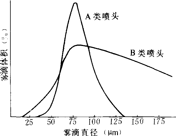 雾滴分布图 (据E.Moser,1981) 图中A类喷头产生的雾滴,集中在较窄的谱段内,雾滴较均匀。绝大部分雾滴是靶标截获率最高的尺寸,是控滴喷雾的理想喷头类型。用较少的药液就能使靶标均匀覆盖,取得良好的药效。离心喷头的雾滴谱属于A类。B类喷头产生的雾滴,其尺寸大小差异很大,各谱段都占相当比例的药液量。若用于对单一形状的靶标喷雾,只有少量药液的粒径处在靶标的最佳粒径范围内,而沉积在靶标上,因此药液回收率极低。这类喷头适用于多种形状的靶标,例如同时防治多种类型杂草的喷撒作业。液力式喷头的雾滴谱分布属于此类。 雾滴分布的集中或分散状况,称为雾滴分布均匀度,可用扩散比(ratio of diffusion,RD)和相对粒谱宽度(relative span,RS)表示。 式中 NMD为数量中值直径; VMD为体积中值直径。如果雾滴群的各雾滴直径相同,则不论用体积中径或数量中径表示雾滴尺寸,都为同一数值,扩散比值为1。这种现象在实际喷雾中不可能存在,但扩散比值愈接近于1,则表示雾滴分布范围愈窄(或称雾滴谱较窄),雾滴均匀。反之,则表示雾滴尺寸分布范围较宽。一般认为,扩散比在0.67~1的范围内,雾滴分布属于较均匀的范围。 式中 DV10、DV90分别表示在一次喷雾中,将全部雾滴的体积从小到大累积到分别占全部雾滴体积总和的10%和90%时,所对应的雾滴直径值。有了DV10和Dv90值,就能了解介于这两值之间的大多数雾滴的直径范围。再与体积中径VMD相比,就可知雾滴的均匀程度。比值越小,表示雾滴越均匀。有些国家明确要求植物保护机械的喷头,必须给出VMD、DV10和DV90三种数值。国际标准ISO 5682/11喷雾机喷头试验方法规定: 以体积中径表示雾滴群直径、以DV16和DV84表明雾滴群直径范围。(见彩图64、68) |