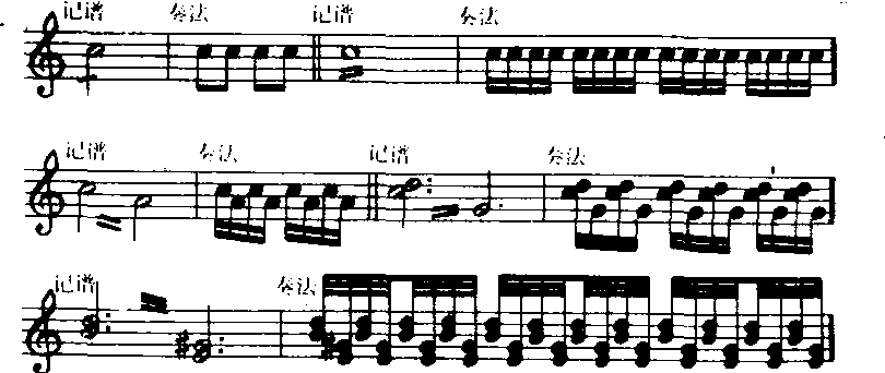 一个单音或一组音急速均匀地交替重复。用同一个单音、不相邻的两个单音、一个单音与一组音、一组音与另一组音均能奏出震音。在弓弦乐器上,单音的震音效果通常是用琴弓的一小部分上下急速的运行奏出; 在竖琴上则将相邻两弦调成同度轮流拨奏而得; 在琵琶上用大、食两指的 “滚”奏出。多音震音在弓弦乐器上有两种演奏法: 音程较小时用手指作震音,音程较大时用琴弓在两弦之间快速摆动来完成。键盘乐器常演奏多音震音,其幅度通常取决于手的跨度,一般不超过一个八度。铜管乐器演奏震音比较困难,也很少见;木管乐器常作三度的震音,效果较好。鼓类乐器用滚奏法奏出的音,亦称震音。震音记号用斜线标记,斜线的数目相当于所奏震音符尾的数目。单音震音的总时值与音符时值相等,多音震音的总时值等于两个音或两个和弦中的一个。