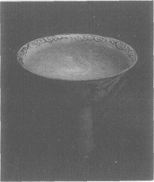 元。通高11.4厘米,口径13厘米。吉林省博物馆藏。此碗侈口,弧形腹、竹节样高足。碗内口沿上绘青花卷草纹一周,碗壁凸印两条行龙,外壁在青花火焰纹的衬托下,一青花龙挺身腾飞。青花凝聚处有黑色斑点,使用的是进口苏勃泥青。釉色白中泛青,纹饰细腻,腾龙矫健雄劲。