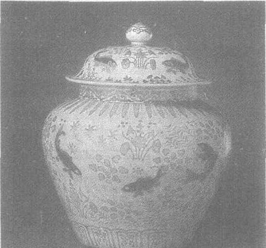 明嘉靖。高41.2厘米,口径21.8厘米。北京故宫博物院藏。此罐在莲瓣纹装点的边饰内以青花绘鱼藻莲花纹,矾红绘制鱼,鱼轮廓及鱼鳞用褐彩勾勒。所绘图案极为生动:各具姿态的游鱼,随波而动的水藻和微风轻弄的莲荷,画笔所到之处,无不轻盈洒脱。特别是鱼儿的描绘,它以黄色为地,鱼脊至鱼腹施以深浅不同的矾红,以此突出鱼儿的立体感,收到良好的视觉效果。纹饰中苍翠的青花和深浓的矾红艳丽明快,活泼清新。罐盖不以碎花之类装饰而仍饰罐腹相同的纹饰,给人以与众不同的恢宏之感。