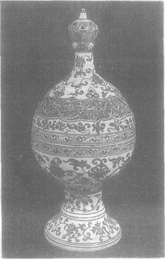 明宣德。通高40.4厘米,口径17.3厘米。台北故宫博物院藏。宣德时期是我国青花瓷器的高度发展时期,造型多样,纹饰优美,以进口钴料“苏泥勃青”绘制的青花色泽浓艳,被认为是明代瓷器之冠。此花薰形制似两个扣在一起的铜豆。造型规整,白釉泛青,釉面莹亮。器身绘多层纹饰:卷草纹、缠枝蕃莲、莲瓣纹;器盖中部有镂空牡丹花卉和如意云纹各一周。青花色泽呈深蓝色,并有黑疵斑点。是件秀丽典雅的艺术品。