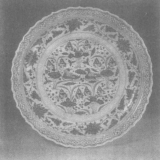 | 释义 | 青花鸳鸯莲纹瓷盘 青花鸳鸯莲纹瓷盘元。高6.7厘米,口径46.5厘米。北京故宫博物院藏。此盘菱花式口,折沿,圈足,砂底。以青料在盘内外绘画。盘外壁绘缠枝莲。盘内壁绘3层纹饰:口沿画锦纹一周;盘里画缠枝莲花六朵;盘心为主题纹饰,池塘内,水波荡漾,莲荷亭亭玉立,两只鸳鸯在荷叶间轻游,它们顾盼追逐,情话喁喁。画面风格清新,很有意境,显示出元代瓷器绘画已达到很高的水平。类似的大型青花折沿盘,元代景德镇曾烧制甚多。