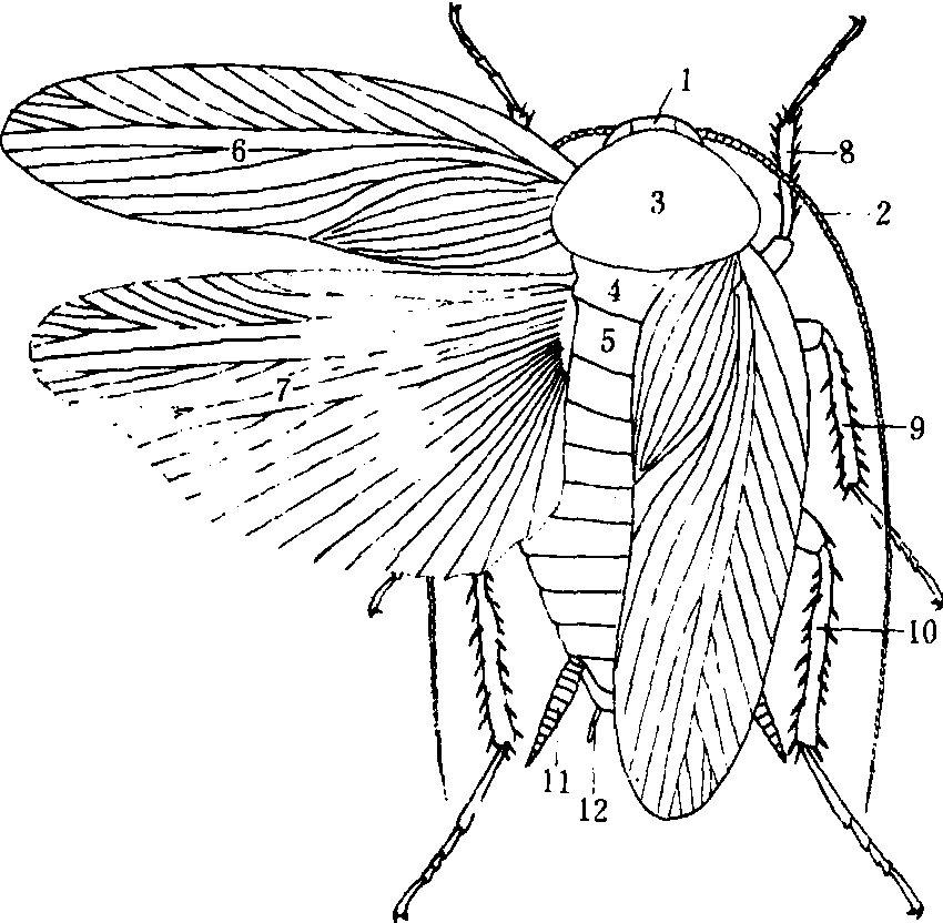 形态 如图2所示,体扁平,小至大型。体色黄褐、红褐至黑色。头部较小,隐藏于前胸背板下,活动自如; 单眼一对,复眼发达,肾形; 触角丝状。前胸背板发达,常为梯形或椭圆形;中、后胸形状类似,略为梯形或方形。足3对,常由前至后逐对增大,腿节粗壮,中、后足腿节下缘具刺列,或无刺列,或仅1~4个小刺,胫节细长,亦具刺列,跗节5节,有一对爪,中垫一般发达。翅通常两对,前翅革质,后翅膜质;有的前、后翅均退化或消失,有的雄虫翅发达,雌虫翅缺。静止时,前翅平置,左翅盖于右翅之上;后翅臀区或折叠成扇状,或平置,仅1~2折。翅脉多,翅面划分为4个区域:前缘域,径缘域,中肘域,臀域。前翅Sc脉退化,有时仅于翅基部略现痕迹,R脉及Cu脉分支多,Rs脉缺,M脉常较简单,A脉多。腹部宽扁,11节,通常见到背板10节,腹板9节。第一节背板甚短,第十节成肛上板,有分节尾须一对,第十一节退化,仅存痕迹;腹板第一节退化,最末一节成下生殖板,雄虫为第九节,雌虫为第七节(第八、九两节被第七节所覆盖);雄虫下生殖板上着生腹刺一对,雌虫无腹刺,这是雌雄鉴别的依据。第五至八节,其中的第一或第二节背板中央有背腺开口。雄性阳茎常是3个叶状突起,生殖孔位于阳茎叶的中间。阳茎叶的数目、形状可作分类依据。雌性产卵器及生殖孔藏在生殖腔内,产卵瓣有夹持卵鞘的功能。 图2 蜚蠊成虫模式图
