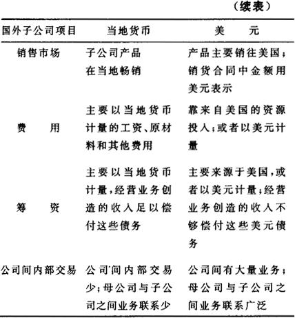 功能性货币是跨国公司子公司在其所处的经济环境中创造和支用现金的货币。 功能性货币是美国财务会计准则委员会第52号声明首次提出,与报表货币区分开来的。一般说来,功能性货币的选择有三种情况,如果子公司在当地国家中相对的“自给自足”,业务基本上限于当地国家之内,则功能性货币即为当地货币。 例如英国子公司在当地生产和销售其大部分产品,那么其功能性货币是英镑。 另一种情况是,子公司的业务是整个公司的有机组成部分,是公司业务的扩展和延伸,那么功能性货币是美元。例如,香港装配工厂从美国母公司运进零部件加以组装,然后将成品销往美国。第三种情况,功能性货币既不是当地货币,也不是美元,而是第三国货币。尽管各个公司在选择功能性货币时有相当大的自主权,但必须说明的是,在高度通货膨胀(3年之内通货膨胀累计接近100%)的国家里,功能性货币必须是美元。除此之外,大多数子公司都习惯于用当地货币作为功能性货币。 表4-7-1 功能性货币决定条件表