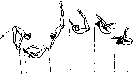 高低杠低难度动作之一。在60年代的成套动作中算是难度较高的动作。随着体操的发展,其结束姿势不利于连接体操规则要求的动作,因此从70年代起就很少有人再采用此类动作。动作要领:是由前脚掌踏杠和起踵的屈体立撑开始,折紧身体,提臀并向远处后倒做近3/4周的踏杠回环,当身体刚过垂直部位接近水平面时,两脚向高杠方向射出,然后利用制动腿使上身赶上腿的速度而由低杠换握成高杠的屈体悬垂。因为这个动作是低杠脱手再握高杠,所以动作本身要加速度,在两腿脱杠向高杠射浪时,身体要保持相当的紧张度,放手的时间要稍晚于腿,千万不能同时离杠。它还可以分腿立撑做,也可做成分腿屈体悬垂。对这个动作必须加强保护,初学时往往不容易抓住高杠而跌下。保护和帮助时教练员站在杠前一侧,一手托背,一手托臀部,并随着运动员身体的上升换握,顺势托成高杠屈体悬垂。