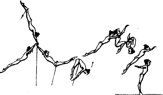 释义 | 面向内,高杠大摆落下低杠腹回环绷杠团身后空翻下 面向内,高杠大摆落下低杠腹回环绷杠团身后空翻下是高低杠的高难度动作。如果顺利完成该动作,是D组动作,有0.1的加分。在70年代末期,低杠向后腹回环绷杠类的下法由转体的动作开始发展到空翻动作。当时该下法虽在国际上不流行(受绷杠技术的掌握程度所限),但在中国则为体操界所重视,进行了重点的突破。由于完成该下法的运动员均未能参加世界大赛,故应视前苏联运动员穆辛娜在第19届世界体操锦标赛中首先完成该下法。动作要领:从面向内的高杠大摆落下开始,做低杠的向后腹回环(参见“面向内,高杠大摆落下低杠向后腹回环绷杠直体下”的该部分过程)。当肩部回环至杠下垂线前70°左右,双脚至杠后水平线下35°左右时,制动双腿,背肌收缩,做以上体为主下肢为辅的反振动作。利用此反振及杠梁的反弹将髋部绷离杠面,沿杠前水平线上约40°方向含胸立肩直体飘出,顺势直体向后翻转同时屈膝收腹抱腿翻臀部,在腾空中绕身体横轴向后团身翻转一周,落下成背对杠站立。练习者先做绷杠直体下立肩直体后躺。在做下法全过程时,帮助者可站在低杠外一侧,当练习者绷杠时,用一手托上腹部,往前上方快速助力,帮助其腾空飘出和向后的翻转。用悬挂式保护带助力亦可。 ☚ 面向内,高杠大摆落下低杠向后腹回环绷杠转体720°下 面向内,高杠大摆落下低杠向后腹回环绷杠转体180°团身前空翻下 ☛ |