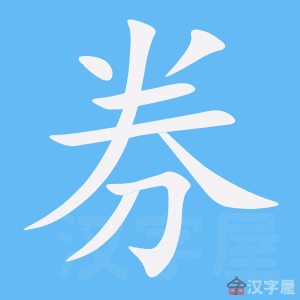 ,既是声旁也是形旁,是“卷”的省略。券,篆文 = (“卷”的省略)+ (刀,分),造字本义:古代刻画着标记、并一分为二的简牍契据,双方各执其一,作为买卖或债务凭证。隶书 将篆文的 写成 。 附 文言版《説文解字》:券,契也。从刀聲。券別之書,以刀判契其旁,故曰契券。 附 白话版《说文解字》:券,契据。字形采用“刀”作边旁,“”作声旁。契卷的文书,用刀刮刻边缘以便日后判识,所以叫契卷。 引申线索