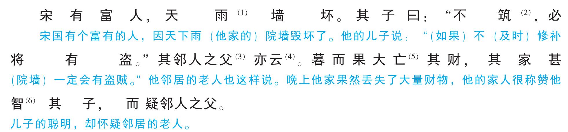 课文导读 韩非 (约前280—前233), 战国末期韩国人, 著名思想家。 他出身贵族, 屡次上书向韩王进谏, 改革政治, 实行富国强兵的政策, 均未被采纳。 后来得到秦始皇的赏识,在秦国任客卿。 不久便被他的同学李斯等人谗言所陷, 下狱后被逼自杀, 死时47岁。他著有 《韩非子》 一书, 共20卷, 55篇。 笔锋犀利, 说理透辟, 常用寓言故事阐明道理, 富有说服力。 其中许多寓言故事一直流传于世, 《智子疑邻》 就是其中的一篇。 《智子疑邻》 这则故事, 因 “天雨” 而导致 “墙坏”, 因 “墙坏” 而致失盗, 对此儿子和邻人之父都有相同预见, 而宋国富人却 “智子疑邻”。 这则寓言的本意是向别人进言, 要注意自己跟听言者的关系, 如果关系疏远, 即便正确, 效果也不见得好———这是从消极方面说的。 如果从积极方面就可以引申为: 听意见只看是否正确, 而不要看这意见是什么人提出的, 对人不能持偏见。 课文注译 宋有富人,天雨(1)墙坏。其子曰:“不筑(2),必 将有盗。”其邻人之父(3)亦云(4)。暮而果大亡(5)其财,其家甚 智(6)其子,而疑邻人之父。