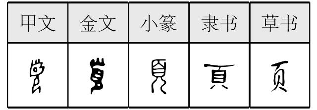 象形,甲骨文、金文、小篆象人形,特别突出头部,隶定为“頁”。本义读xié,头部,与“首”为一字分化;又读yè,假借为书籍或报刊等的篇或张,由此引申为像书页的东西、量词(用于书籍、报刊等用纸的一张或一张纸的一面)等。元代俗字把偏旁“頁”简作“页”,据草书楷化;《简化字表》进一步把独立的字也同样简化。 【辨析】 ❶以“页(頁)”作意符构成的字多与头部、头的样子或容貌、头的动作等有关,如“额、颜、题、项、颈、须、顷、颁、颓、顿、颔”。 ❷“页(頁)”可作类推简化偏旁使用,如:顶(頂)、嚣(囂)、蓣(蕷)。页 頁; 甲 金 篆 隶xié【析形】象形字。甲骨文字形像人头之形,下从“人”作为烘托。金文字形增加了头上毛发之形。“页”与“首”古本一字。 【释义】《说文》:“头也。”本义是人头。故从页之字多与头面的意义有关。如:颜(本义是额)、颠(本义是头顶)、题(本义是额)、领(本义是脖子)、项(本义是脖子的后部)、顾(本义是回头看)、顿(本义是磕头)。表示人头的“页”后世只用作偏旁。现代的“页”字读yè,表示书页。 【shape analysis】It is the pictograph character.In Oracle,the character is shaped like a head with a human shape below to support it.It is added the shape of hair in Bronze Inscriptions.页and 首(shǒu,head)were the same character in ancient Chinese. 【original meaning】A head of a human being. |