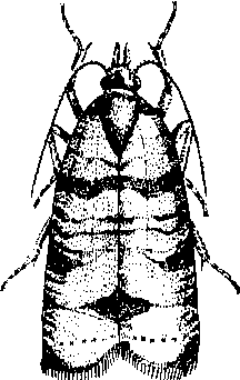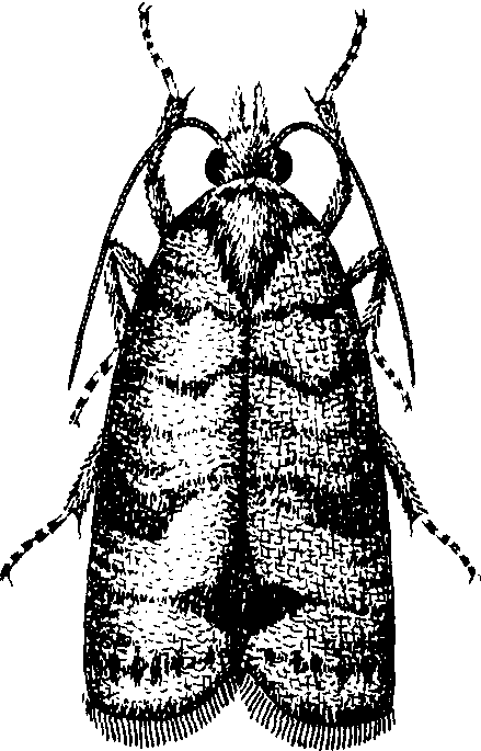 释义 | 顶梢卷叶蛾apple fruit licker苹果等果树的嫩梢新叶害虫。又名顶芽卷叶蛾,芽白小卷叶蛾。学名Spilonota lechriaspis Meyrick。鳞翅目,卷蛾科。此虫于日本、朝鲜及中国辽宁、河北、山东、河南、山西、陕西、宁夏、湖北、江西、安徽、江苏等省区均有分布。为害苹果、梨、桃、李、杏、海棠、红花、山楂、枇杷等。成虫体长6~8毫米,翅展12~15毫米,全体淡灰褐色,触角各节具褐色轮纹,前翅近长方形,翅上有3个暗色斑,一在近基角处,由前缘伸向后缘;一在前缘中部,仅达翅中央; 一在近后缘角处,呈三角形。当两翅合拢时,两三角形合成一菱形。卵扁椭圆形,乳白或淡黄色,卵面光滑有光泽。末龄幼虫粗短,长8~10毫米,污白色,头、前胸背板、胸足均漆黑色,无臀栉。蛹长6~8毫米,黄褐色,纺锤形,腹末有8个钩状刺和6个小齿。茧椭圆形,外有黄白色绒毛(见图)。