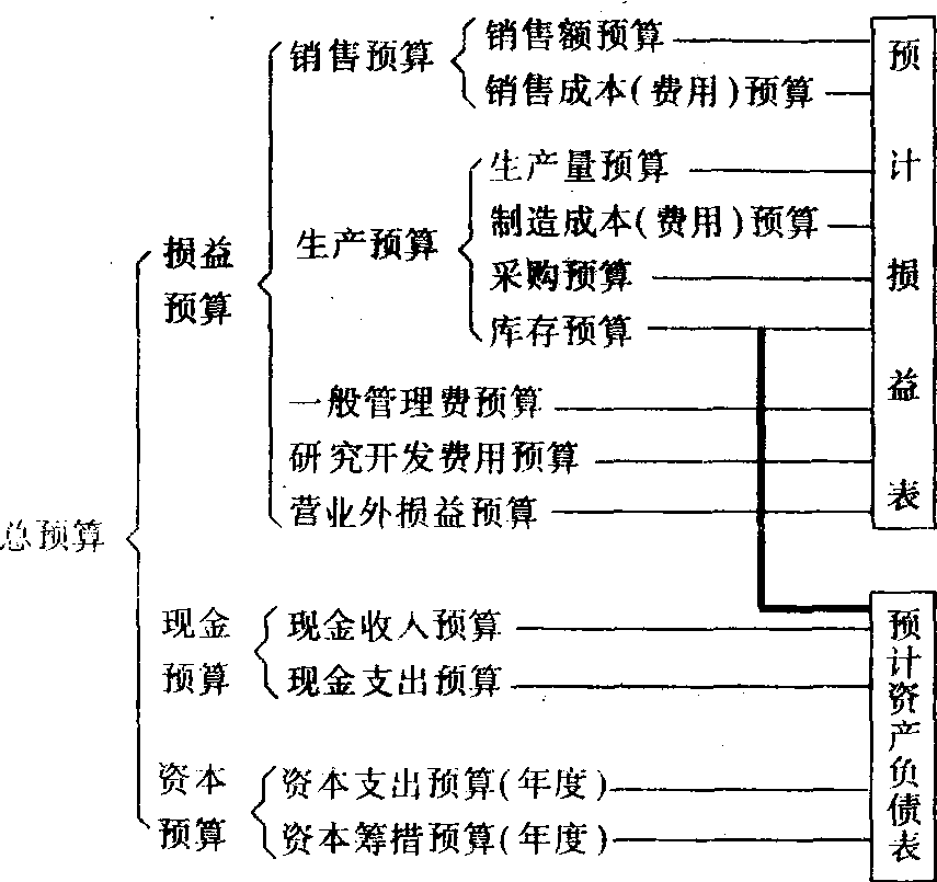 以总预算 (全面预算) 为基础,由各个部门 (分项) 预算所组成的综合预算指标系统。由于经营方针、经营规模、管理组织和业务情况等方面的差异,不同企业的预算体系是不一样的。确立预算体系的目的是为了正确编制预算,充分发挥预算管理的作用,更好地协调企业在预算期内的各项生产经营活动。在同一企业里,可以按照经营管理职能结构或责任结构建立预算体系,也可以按照分期损益计算结构和资产计算结构建立预算体系。按照分期损益计算结构和资产计算结构建立的预算体系见图: