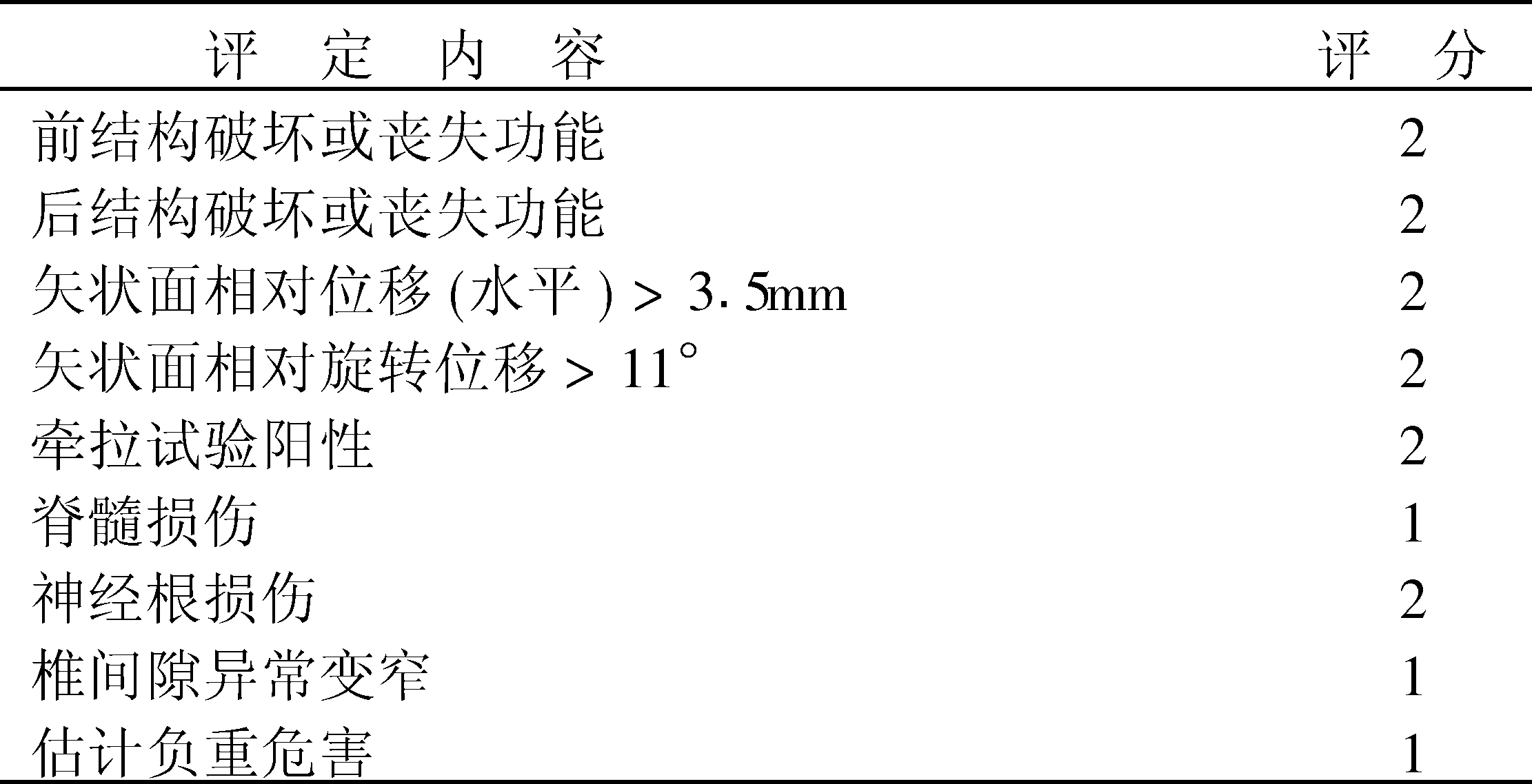 ❷相邻两椎体间成角大于11°。符合上述标准说明前或后韧带复合体有损伤,提示为不稳。此外以下3点可作参考:a.相邻两棘突间距增宽;b.颈椎生理弧度消失;c.关节突间接触面丧失≥50%,并往往丧失平行关系。由于White标准未考虑脊髓损伤状况,因此可采用评分法对脊髓损伤状况进行较为全面的评定(见下表),该法亦可用于治疗效果的观察评定。结果评定: