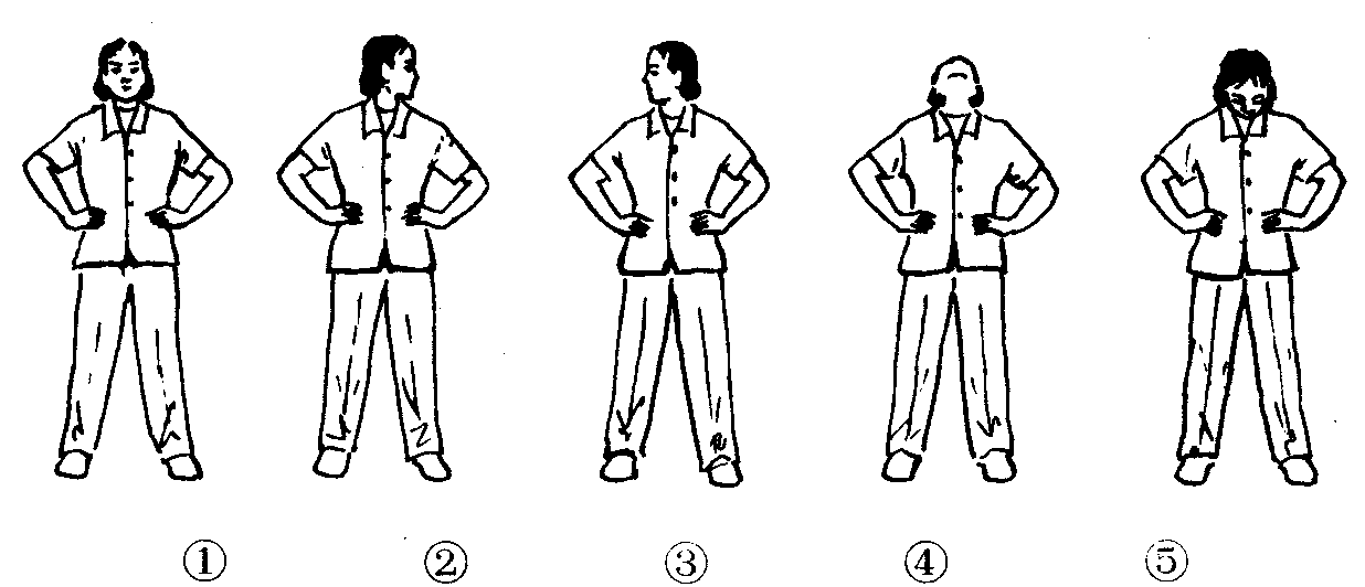 练功十八法第1套第1节。主要是通过头部的活动使颈部疾病得以缓解。动作过程:两腿分立,稍宽于肩,两手叉腰,拇指朝后。(图2—4—122—❶)❶头颈正直向左旋转至最大幅度。(图2—4—122—❷)❷还原成预备姿势。❸头颈向右旋转至最大幅度。(图2—4—122—❸)❹还原成预备姿势。❺抬头看天。(图2—4—122—❹)❻还原成预备姿势。❼低头看地,下颌尽量接触胸骨。(图2—4—122—❺)上述动作共做4个8拍。注意事项:练习时要保持上体正直,不能挺腹。颈部肌肉以产生酸胀感为度。此功法对颈部急性扭伤,慢性颈部软组织疾病都具有一定的疗效。