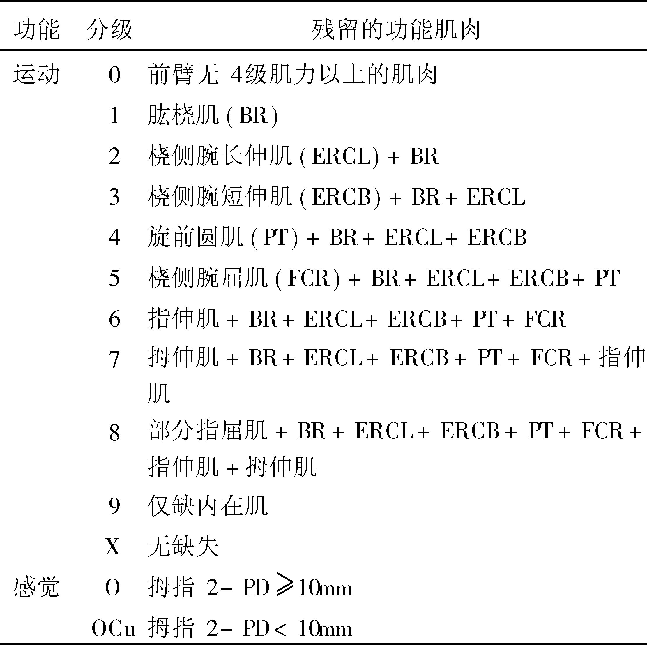 按国际截瘫医学会(International Medical Society of Paraplegia,IMSOP)1984年制订的标准进行评级(下表)。“功能肌肉”系手法检查该肌肉,肌力在4级或4级以上者。感觉仅检查拇指指腹的静态两点辨别觉(2-PD,Weber法)。O代表仅有视觉功能,病人仅能依靠视力控制手的活动;OCu代表兼有视觉与拇指指腹皮肤感觉,关节位置觉良好,可帮助控制手的活动。