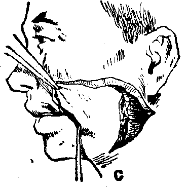 颊部贯通性缺损的外科整复术,必须口腔内和面部双层修复,口腔内的粘膜缺损可用翻转缝合缺损边缘的粘膜或皮肤组织,使上皮面向口腔侧,创面向外,缝合后形成颊粘膜的衬里,然后从面颊或颈部转移皮瓣缝合至缺损创面上,对于面积较大的颊部贯通性缺损,可用全额皮瓣摺叠法转移术,或用肩胸皮瓣摺叠法转移术,或皮瓣与游离皮片联合使用,或用胸锁乳突肌肌皮瓣或胸大肌肌皮瓣转移术修补之(图)。 ☚ 唇部组织缺损整复术 下颌骨义颌植入术 ☛ |
