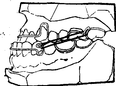 颌间牵引是以上颌牙列或下颌牙列为支抗,或上下牙列互为支抗,利用橡皮圈的弹力,牵引对颌牙列至远中或近中,或互相牵引以改变上下牙列原有的近中或远中咬合关系为中性颌关系。 例如: 下颌前突的病人, 其上下颌牙列均整齐且大小协调者,在上下颌均作简单可摘矫正器。于上颌第一磨牙卡环颊侧近中部分作向远中的拉钩,在下颌唇弓尖牙弯曲处作向近中的拉钩,并在两拉钩上套橡皮圈(图)。下颌即可逐渐向远中移动,一段时间后, 便可将近中颌关系改变成中性颌关系。 又如,下颌后缩的病人,其上下颌牙弓均整齐且大小协调者,在上下颌也可采用相同的可摘矫正器,但须将上下颌的拉钩互相调换位置,两拉钩间仍套橡皮圈, 下颌即可逐渐向近中移动, 而将远中颌改变为中性颌。 又如, 上颌前突, 同时下颌后缩, 上下颌牙列均整齐,且大小协调。可采用上述牵引方法,使上下牙列相对移动, 以改变远中颌关系为中性颌关系。 以上装置,为了牵引时滑行的方便,初期可在上下颌矫正器上加一薄而平的颌垫, 以减少尖窝锁结便于牵引。 当牵引接近中性颌时,应磨除颌垫并进行咬合改正。牵引的时间需长些,后期可换用弹力较小的橡皮圈,以利保持矫治效果。