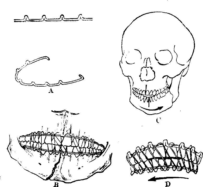 释义 | 颌骨骨折口内固定法 颌骨骨折口内固定法颌骨骨折经过手法复位后需要加以制动固定。颌骨由于其特殊解剖关系,可以利用牙齿作复位固定。牙齿确切地恢复咬合关系,即能获得骨折端良好的复位,因此在口腔内利用牙齿作稳妥的结扎固定,就能获得骨折的愈合。口内固定法有单颌固定和颌间固定之分。此外在无牙列的病人中,尚可采用颌周固定的单颌固定法。 图1 孔环颌间结扎法 牙弓夹板颌间固定 采用单颌牙弓夹板的方法,在上下颌各制备一牙弓夹板。然后用细结扎丝穿过上下牙弓夹板,在正常咬合关系位置上加以结扎。因其不能作进一步牵拉作用,故只适于单纯性颌骨骨折。 带钩牙弓夹板颌间固定 即采用在牙弓夹板上带有许多突起的小钩,便于悬挂橡皮圈,作为颌间牵引复位固定用。这种夹板有两种形式,一种为成品带有小钩的金属夹板,只需临时将其弯曲适应病人牙列的弧度即能应用。另一种系采用直径2mm的铝丝弯制而成,而后分别安置在上下颌牙列上,根据复位的情况,用橡皮圈套在上下颌夹板的小钩上,获得牵拉复位固定的目的。此法特别适用于下颌双发性骨折,手法一时不易复位的病例,或颌骨骨折处已初步有纤维错位愈合的病例。应用时可作分段夹板,即将铝丝牙弓夹板剪成两段,分别结扎于两骨折段牙上,然后通过弹性牵引,逐渐复位,俟复位后,再重新换置完整的牙弓夹板。 带钩铝丝牙弓夹板制作法 取20cm长铝丝一根,用平钳或尖嘴钳先夹扁一端,弯成钩状,使能楔入一端最末两个牙的间隙内,或嵌于第二磨牙的远中面。然后用平钳使铝丝屈曲贴俯于每个牙的间隙内,每距1~1.5cm处,用尖嘴钳弯制0.5cm高度的挂钩,钩与牙龈有一定的距离,一般与牙面呈30~40°角,以避免压迫损伤牙龈。共弯制6~7个挂钩,最后切断其末端,亦将其夹扁、弯曲而压入牙间隙内。带钩铝丝牙弓夹板需同时制作两副,最后用直径约0.5mm的不锈钢丝将夹板固定在上、下颌的牙上,以便作牵引复位固定用。每个结扎丝的末端,均应剪短弯成环形而埋于夹板之下,结扎时并应顺时针方向扭结,以便他人亦可加固检查,不致发生谬误。牵拉的橡皮圈,可用乳胶管剪成。橡皮圈套在上下颌的挂钩上,可作复位固定,亦可作牵引复位,牵引的方向应与骨折移位的方向相反(图2)。 图2 带钩铝丝牙弓夹板 颌间固定的优点是方法简单,疗效可靠。其缺点为上下颌被结扎固定,不利于进食,尤以伤员后送过程中,如发生呕吐易造成意外。为了在紧急情况下能解除颌间固定,护送的人员应手头备有钢丝剪刀,必要时可立即剪断颌间连接的钢丝或橡皮圈。对橡皮圈牵引的病例,可在每侧所悬挂的橡皮圈中,穿过一根粗丝线,将其两末端牵向口外,用胶布贴于面颊部,遇有紧急情况,用力牵拉丝线,即可将橡皮圈迅速拉脱。 ☚ 鼻骨骨折 颌骨骨折口外固定法 ☛ |