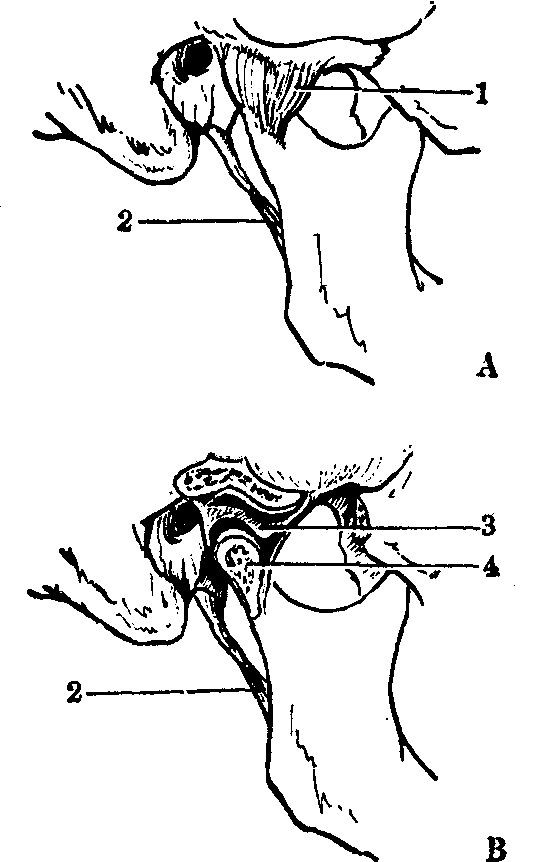 释义 | 颞下颌关节articulatio tempor-omandibulavis系颌面部可动关节。由下颌骨的下颌头与颞骨的下颌窝形成关节,内有关节盘。与下颌骨进行前后运动时关节盘可同时前后滑动,下颌关节可行上提与下掣运动及侧方运动。此关节外伤、炎症、脱位、骨折可影响其功能活动,其中以关节脱位最为常见。 颞下颌关节temporomandibular joint亦称下颌关节。由下颌头及颞骨的下颌窝构成。关节囊松弛,向上附着于下颌窝和关节结节周缘,向下附着于下颌颈。关节腔内有纤维软骨构成的关节盘,呈“乙”字形,周围附着于关节囊。关节盘将关节腔分为上、下两部。关节囊外侧有从颧弓后份至下颌颈的外侧韧带(亦称颞下颌韧带)加固。下颌关节为联合关节,可使下颌骨上提、下降、向前、向后及侧方运动。 颞下颌关节 颞下颌关节颞下颌关节(见图)由下颌头与颞骨下颌窝和关节结节组成,左右合成一联合关节,主理张口闭口和咀嚼运动。关节囊松弛,侧方为内、外侧韧带所加强。囊内的关节盘呈卵圆形,由纤维软骨组成,区分为前、中、后三部分。上面呈鞍状,前凹后凸,与关节结节和下颌窝的凸凹轮廓相对应; 下面凹正对下颌头,周缘与关节囊相接,前缘与穿过关节囊的翼外肌腱相连。关节盘将关节腔分成上、下两半。关节外更有蝶下颌韧带(蝶棘至下颌小舌)和茎突下颌韧带(茎突至下颌角)予以加固。 颞下颌关节 1.关节囊 2. 茎突下颌韧带 3.关节盘 4.下颌髁状突左右。极度开口时,下颌头甚至可滑到关节结节之前,进入颞下窝,成为前脱位。复位时须以大拇指按紧左、右磨牙下压,同时将颏部上抬,把下颌头牵拉向下,越过关节结节,然后推向后上,将下颌头纳回下颌窝。 ☚ 颅骨的连结 脊柱 ☛ 颞下颌关节 颞下颌关节颞下颌关节是颌面部唯一的联动关节,具有转动和滑动两种运动。由颞骨的关节凹、下颌骨的髁突、关节凹和髁突间的关节盘、包绕在关节周围的关节囊和关节韧带五部分组成(图)。