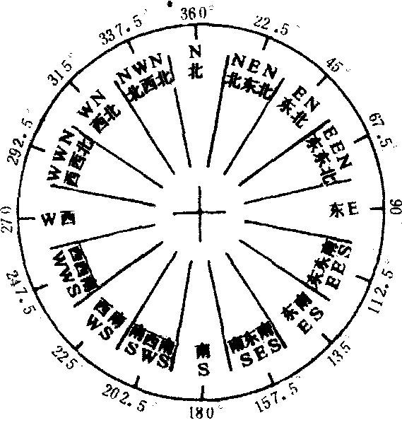 风fengwind气象要素之一, 是相对于地表面的空气运动。通常指它的水平分量。 风的表示 一般用风向和风速(风力或风级)来表示。风向指气流的来向, 常用16方位来表示(图1),也可用矢量相对于子午线的角度来表示。取北为0°或360°。风速常以米/秒或海里/ 小时(节)为单位, 或以风力等级表示 (见风的观测)。风的概念有时也扩充到包括空气运动的垂直分量, 它的量值在一般情况下比水平分量小得多。