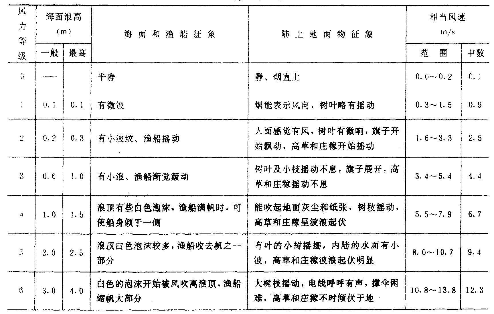 风力等级表2 风 力 等 级 | 海面浪高 (m) | 海面和渔船征象 | 陆上地面物征象 | 一般 | 最高 | 0 | - | | 平静 | 静、 烟直上 | 1 | 0. 1 | 0. 1 | 有微波 | 烟能表示风向、 树叶略有摇动 | 2 | 0. 2 | 0. 3 | 有小波纹、 渔 船摇动 | 人面感觉有风, 树叶有微响, 旗 帜开始飘动, 高 草和庄稼开始摇 动 | 3 | 0. 6 | 1. 0 | 有小浪、 渔船 渐觉颠簸 | 树叶及小枝摇动 不息,旗帜展开, 高草和庄稼摇动 不息 | 4 | 1. 0 | 1. 5 | 浪顶有些白色 泡沫. 渔船满 帆时, 可使船 身倾于一侧 | 能吹起地面灰尘 和纸张, 树枝摇 动, 高草和庄稼 呈波浪起伏 | 5 | 2. 0 | 2. 5 | 浪顶白色泡沫 较多, 渔船收 去帆之一部分 | 有叶的小树摇 摆, 内陆的水面 有小波, 高草和 庄稼波浪起伏明 显 | 6 | 3. 0 | 4. 0 | 白色的泡沫开 始被风吹离浪 顶, 渔船缩帆 大部分 | 大树枝摇动, 电 线呼呼有声, 撑 伞困难, 高草和 庄稼不时倾伏于 地 | 7 | 4. 0 | 5. 5 | 白色泡沫离开 浪顶, 被吹成 条纹状 | 全树摇动, 大树 枝弯下来, 迎风 步行感觉不便 | 8 | 5. 5 | 7. 5 | 白色泡沫被吹 成明显的条纹 状, 进港的渔 船停留不出 | 可折毁小树枝, 人迎风前行感觉 阻力甚大 | 9 | 7. 0 | 10. 0 | 被风吹起的浪 花使水平能见 度减小, 机帆 船航行困难 | 草房遭受破坏, 屋瓦被掀起,大 树枝可折断 |