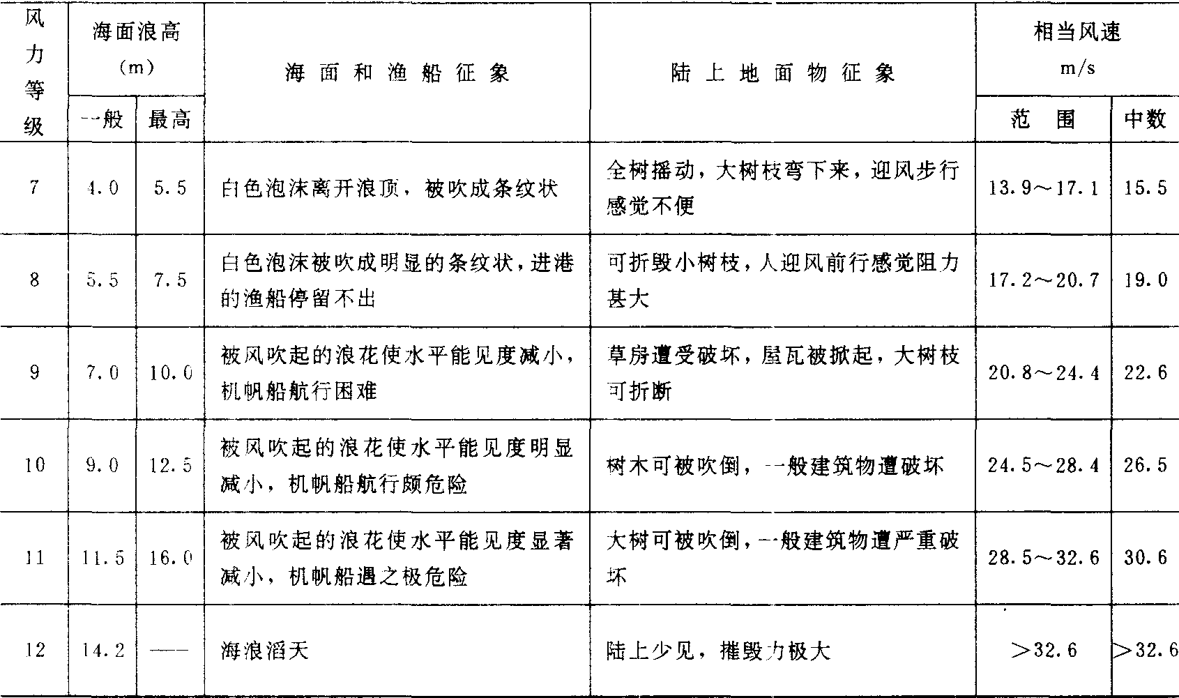 续 表风 力 等 级 | 海面浪高 (m) | 海面和渔船征象 | 陆上地面物征象 | 一般 | 最高 | 10 | 9.0 | 12. 5 | 被风吹起的浪 花使水平能见 度明显减小, 机帆船航行危 险 | 树木可被吹倒, 一般建筑物遭破 坏 | 11 | 11. 5 | 16.0 | 被风吹起的浪 花使水平能见 度显著减小, 机帆船遇之极 危险 | 大树可被吹倒, 一般建筑物遭严 重破坏 | 12 | 14.2 | - | 海浪滔天 | 陆上少见, 摧毁 力极大 |