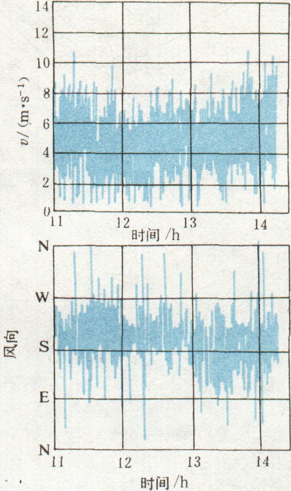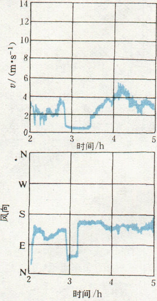 图 2 风的脉动特性 (南京气象学院,1965年5月19日) 在近地层, 风随高度的变化接近对数的关系。测风仪器虽不能置于标准高度10米处, 但在安装条件达到“开阔”的要求 (即风速表离障碍物的距离至少是障碍物高度的10倍)时,高度为h处的风速与10米高处的风速的关系可近似地用赫尔曼(Hellman)公式的简化形式来表示, 即:υh=υ10〔0.233+0.656 lg (h+4.75)〕 式中υh为h(米)高度处的风速, υ10为仪器安装在标准高度10米处的风速。 阵风及阵风分量 风在短时间内的急剧变化。在一定时段内风速偏离其平均值的一个正的或负的偏距, 其持续时间不超过2分钟即称为阵风。其在某一规定方向(如水平方向、垂直方向)的分量称为阵风分量。当阵风风速超过20米/秒时, 常带来大的破坏性。这种突然发作的强阵风称为飑。飑的持续时间短促,特征是风速突增、风向突变, 其他气象要素也有剧烈变化(见飑线)。