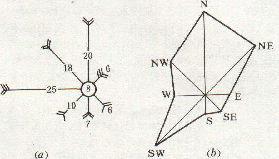图3 风玫瑰 阵风度及阵风度分量 在规定的时段内, 最大风速和最小风速之间的差值对同时段内平均风速的比值。即阵风度: 式中 υmax和υmin为规定时段内(常取10分钟) 的最大风速和最小风速。其在某一规定方向的阵风度称为阵风度分量。阵风度也可定义为: 在极短时段内观测到的风速或风向偏离其平均值的气流脉动性。这时, 阵风 丨△W丨为t时段内瞬时风速或瞬时风向偏离其平均值的绝对值,K为常量。当风速或风向振幅愈大、脉动愈频繁时, G值就愈大。 风玫瑰 表示某一地点风的分布状况的一种统计图。常有两种表示法:图3(a)由代表该点的中心给出射线,射线的长度代表该风向的出现频率,可用频率百分率标出。圆圈中心的数字代表静风的频率。而箭尾表示各该风向的最大风力。图3(b)是另一种表示法, 将射线的终点联成折线。射线的长度可以表示风向频率, 也可以表示该风向的平均风速 (见风的观测, 风的测量仪器)。风❶病因六淫之一,亦称风气。属阳邪,为外感疾病的先导,故外感多有风证,并常与其他病邪结合而致病,如风寒、风热、风湿、风燥等。《素问·风论》:“故风者百病之长也,至其变化,乃为他病也,无常方,然致有风气也。”症状每有恶风寒、发热及游走性、多变性的特点。《素问·风论》:“风者善行而数变,腠理开则洒然寒,闭则热而闷。” ❷病证之一。指一类具有动摇、震颤或挛急,或眩晕等症状的病证。由于其证候符合“风胜则动”、“诸暴强直,皆属于风”的病机,故称为风证,但由于其致病并非因于感受六淫的风邪,而由肝风内动所致,故又称为内风或风气内动。见内风、风气内动各条。 风油画。刘仁杰作于1989年。画中描绘严冬刚刚过后,春风吹拂大地,一只鹞形风筝在空中飘拂,一位年轻姑娘正赤脚奔跑在起伏不平的田野上。此画以风为主题,突出描绘风吹动的感觉,来表现风造成的人、土地与风筝的和谐运动,使似乎无联系的事物之间形成互相关联的整体,寓意着生命的蓬勃活力。通过外在具象形象的描绘,寻求事物的内在实质与联系,来表达一种内在的情感和寓意,具有象征意味。画面以土褐色为主调,人物形象丰腴,充满活力,艺术语言质朴、自然。获第七届全国美展银牌奖。 风来自大气环流或气团的运行。分为高空风、地面风、风向、风速等。冬季,新疆受蒙古高压影响,除南疆西部和西南部盛行西北风和西风外,其他地区多东北和偏东风。夏季,新疆在热低压的北侧,北疆和南疆西部盛行西北和西风。克里雅河以东因北疆气流绕天山东端,呈顺时针方向转向后灌人南疆,多盛行东北风。以民丰为界,在其东部盛行东北风,以西盛行偏西风。春季盛行风向和夏季相近,秋季盛行风向和冬季相近。 风❶六淫之一。其特点是居无定体,善行而多变,为百病之长,常与其它病邪结合而致病。如风寒、风湿、风热、风燥、风温等皆是。 ❷病证之一。即病理性的内脏之风。
