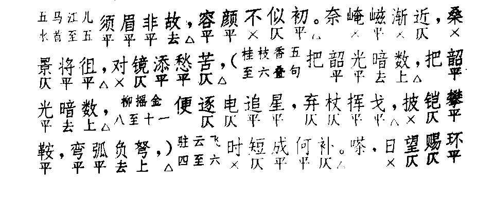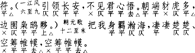 释义 | 风云会四朝元 风云会四朝元吾邱瑞 《运甓记》 ![]() ![]() 全曲廿一句:4△,5△。4,4△,5△。4△,(叠)4△,4,4△,4,4△,5△。嗏5△。4,5△。5△,5△。4,7△,(叠下半句四字)4△。《南词简谱》谓:第五句“为六字。《琵琶》云‘早已成间阻’,用五字句,于是作者皆依之,实是误也。”此五字平仄亦有异,《运甓记》另一支作“衰颓怎与扶”。第二十句本为上三下四句式,但上三字作者多作叠字四字句;末句亦可不用叠句,参〔朝元歌〕。多叠用四支成套,并可组成专场。偶有叠用二支者,如《四贤记·孝养》。小令兼用。一作〔四朝元〕,如《荆钗记·闺念》。 ☚ 江头金桂 惜奴娇序 ☛ |