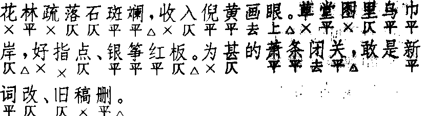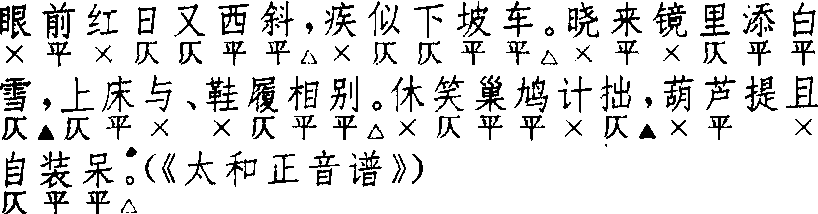 释义 | 风入松 风入松词牌名。因唐僧皎然《风入松》歌而得名。又名《远山横》。有二体:其一双调七十二字,其一双调七十四字或七十六字,上下阕各四平韵。又曲牌名。南北曲均有,字句格律与词牌七十六字体上阕略异。南曲入双调过曲,北曲入双调只曲或套曲。参见“常用词谱”、“常用曲谱”类。 ☚ 粉蝶儿 离亭燕 ☛ 风入松 风入松☚ 千秋岁引 祝英台近 ☛ 风入松 风入松马致远 “百岁光阴”套 ![]() 全曲六句:7△,5△。7▲,7△。6▲,6△。上引马曲与宋词全同。第二句宋词可作四字句,元曲亦有之,如关汉卿《鲁斋郎》“因甚强夺”、白无咎”离情不奈”套“半掩朱扉”,以及其他作上三下四式七字句诸例;散套以作五字句为多。第四句宋词有作六字句者,元曲有杨景贤《刘行首》“寸心天地皆归”及李洞、狄君厚、萧德润散套。末句作五字句为元曲初见,如商政叔“风里杨花”套“闲煞豫章城”,六字折腰句如白朴《梧桐雨》“皆因唱后庭花”实皆五字句也。宋词第三、五句不叶韵,元曲不叶韵者极少。商政叔“风里杨花”套第三、五句叶平韵,白无咎第五句叶平韵,皆甚少见。尚仲贤《柳毅传书》末二句“不俊眼的襄王,对面儿犹疑梦想”,元刊本张国宾《汗衫记》末二句“到今日无吃无穿,你将俺可怜见”,第五句叶平韵,第六句叶仄韵,皆所不宜。散套首牌。小令兼用。张可久、汤式之作,皆为词体。《柳毅传书》误题〔夜行船〕。与南曲小异。 ☚ 夜行船 乔木查 ☛ 风入松 风入松孔尚任 《桃花扇》 ![]() 全曲六句:7△,6△。7△,7△。6△,6△。第二句后四字可作平平平仄或仄仄平平。〔风入松〕用法有三种:一、叠用二支、四支、六支成套,并可组成专场;二、接用〔急三枪〕组成短套,并循环使用;三、用作〔双调〕南北合套,《小孙屠》第九出共四支,中间用〔犯衮〕(即〔急三枪〕)一支。《明珠记·买药》共用六支。小令兼用。与词牌、北曲微异,引子同词牌。以〔风入松〕为主的集曲有〔风入三松〕、〔风入园林〕、〔风入娇音〕,见《南词简谱》。〔风入松犯〕则为〔风入松〕与〔急三枪〕之合称,见无名氏戏文《王祥卧冰》。 ☚ 三月海棠 急三枪 ☛ 风入松 风入松又名《风入松慢》、《远山横》。古琴曲有《风入松》,传为晋嵇康所作。李白诗有句:“风入松下清,露出草间白。”唐僧皎然有《风入松歌》,见《乐府诗集》,调名本此。《宋史·乐志》入林钟商。《填词名角》载《词谱》云:“汉吴叔文善琴,隐居石壁山,山多松树,尝盛夏时抚琴于松下,遂作此操。”查《词谱》卷一七并无上说,疑误。《词律》卷一一列赵彦端所作。《词谱》卷一七以晏幾道所作(柳阴庭院杏梢墙)为正体,双调,七十四字,上、下片各六句四平韵。《词律》列别体二种。 ☚ 丹凤吟 风马儿 ☛ 风入松