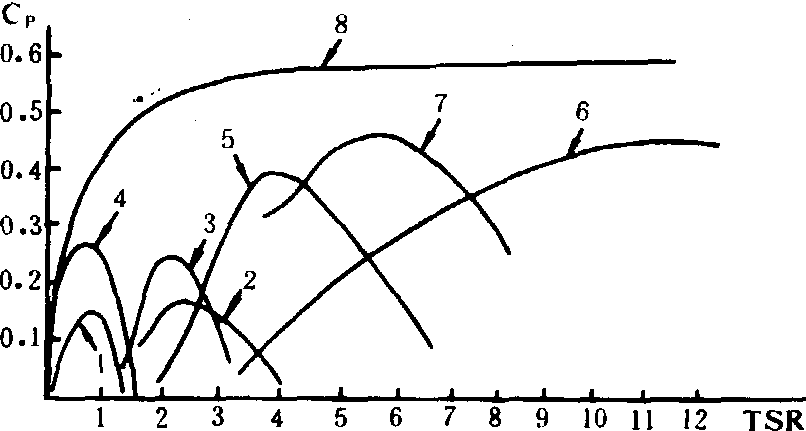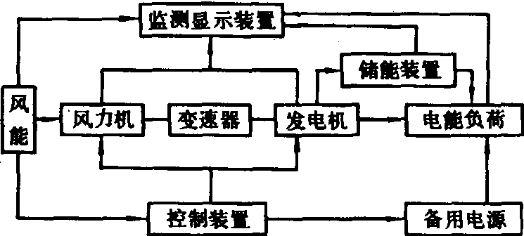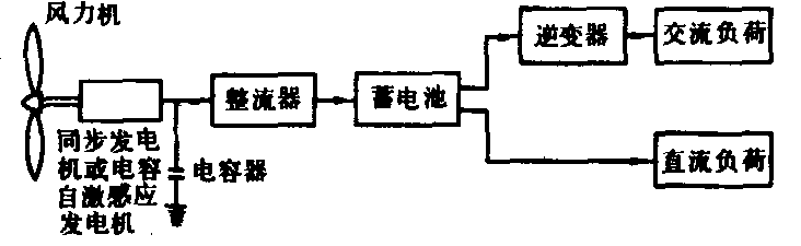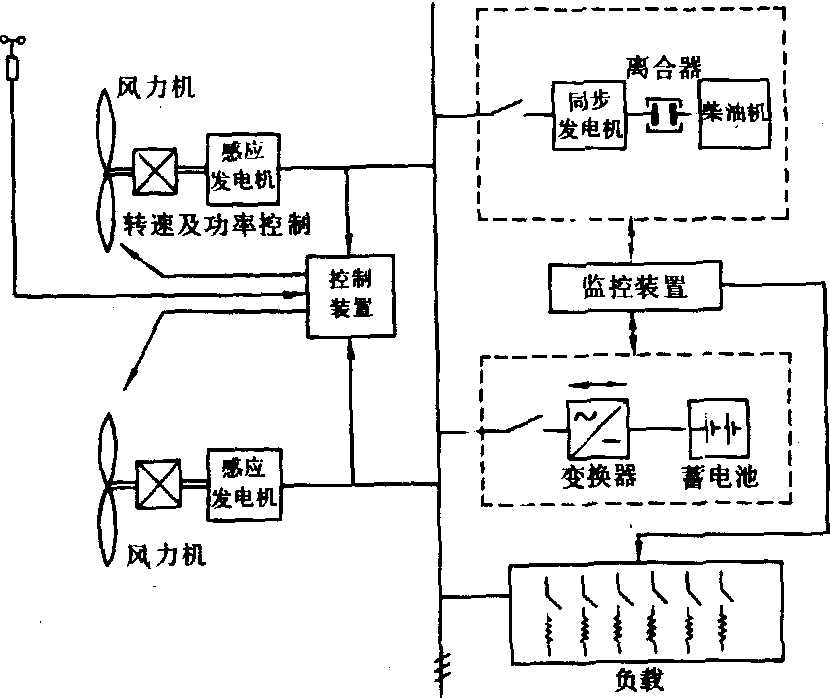 释义 | 风力发电wind power generation利用风能获得电能的转换过程。 图1 风力发电系统的组成 风力发电机组 由风力机、发电机、变速器等组成。100瓦左右的小容量风力发电机一般不设置变速器。风力机在结构型式上可分为水平轴和垂直轴两种(见风力机)。图2表明少叶片螺旋桨及Φ型风轮的功率系数。其运转速度高,适合于风力发电。 独立运行的微型及小型风力发电机组采用永磁式和自励交流发电机。并网运行的风力发电机普遍应用同步发电机和感应发电机。 控制装置 对风力发电机组实行调节转速、电压、频率,防止超速、振动、过负荷或停机的装置。小型风力发电机组一般均附设有控制机构和安全装置。容量较大的风力发电系统多采用微机控制。 储能装置 由于风能的不稳定性,必须配备储能装置。风力发电通常采用蓄电池储能。在地形条件合适的地点可设水库,采用抽水蓄能。与电网并联运行的风力发电系统,不需要另外配备储能装置。 图2 风力机功率系数与叶尖速比的关系 1.隆波尼乌斯型;2.荷兰4叶片式;3.自行车轮式;4.美国多叶片式;5.达里厄型(Φ)型;6.2叶片高速螺旋桨式;7. 3叶片螺旋桨式;8.螺旋桨式风力机理论效率 风力发电的运行方式 风力发电的运行方式分为独立运行、联网运行、组成集群式风力发电站(或称风电场)运行、风力-柴油联合发电系统运行等。 独立运行的风力发电系统 适用于偏远农村、牧区、沿海岛屿、边防哨所、气象台站、电视差转站、导航灯塔等电网达不到的地区。微型及小型风力发电机组多采用蓄电池储能再向负荷供电。如负荷需要交流电,则在蓄电池与负荷之间加入逆变器(图3)。在容量较大的独立运行系统中,不采用蓄电池储能而采取负载开关控制器,按风速变化自动接通与断开负荷(图4),在这种运行方式中,负荷按供电的重要性分类。重要的负荷应保持连续获得电能,次要的负荷则不断地接通与断开,以适应风力机输出能量的变化。 图3 独立运行的风力发电系统 图4 具有负荷调节的独立运行风力发电系统 联网运行的风力发电系统 这种运行方式不存在由于风的随机性而带来的储能问题。中、小容量直至大容量(1000千瓦以上)的风力发电机组皆可采用这种运行方式。联网运行的方式有两种:一种是恒速恒频,即风力发电机组的转速不因风速的波动而变化,从而能维持输出恒定频率的交流电。这种方式简单可靠,是普遍采用的,其缺点是不能充分地利用风能,因为风力机只有在一定的叶尖速比下才能达到最高的风能利用率。另一种方式是变速恒频,即风力发电机的转速随风速的起伏作变速运转,通过在发电机端配置特殊功率电子装置以获得恒定频率的交流电。这种方式比较复杂,其优点是可以提高风能的利用率,因此成为发展的方向。采用这种方式必须注意解决由于变速运行而在机组及其支撑结构上出现的共振现象。 集群式风力发电场 在风能资源良好的地区将数十台、数百台或数千台单机容量为数十千瓦至数百千瓦甚至1000千瓦以上的风力发电机组按一定的阵列布局方式成群按装,即可组成集群式风力发电站(或称风电场)。这是一种大规模开发利用风能的有效形式,有利于降低风力发电设备投资费用及发电成本。 风电场内风力发电机组的排列方式目前仍处于研究阶段,已经建造的风电场所遵循的原则是在平坦地面上,机组按矩阵分布排列,机组沿盛行风向前后间距离约为机组风轮直径的7~10倍。与盛行风向垂直方向上机组间距离约为风轮直径的1.5~2倍;在地形起伏不平的地面上,机组在等风能密度线上按装,机组之间的距离比在平坦地形上的要小。在地形复杂的丘陵或山地,除按以上原则考虑风力机尾流的影响外,还要考虑地形造成的端流的影响。 风力机、柴油机联合发电系统 可以实现稳定持续的供电,具有两种不同的运行方式,即切换运行及并联运行。切换运行是风力发电装置及柴油发电装置在机械上及电气上无任何联系,有风时由风力发电机供电,无风时由柴油发电机供电。并联运行则是风力发电机与柴油发电机在电路上并联后向负荷供电(图5)。这种运行方式在技术上比较复杂,当风况及负荷变化时需及时调节风力及柴油发电机的出率并维持系统的稳定,同时应尽量降低柴油机的起动与停机的次数及轻负载下运转。采用短时蓄电池储能或配备储能飞轮,可以减少柴油机起停次数。 图5 风力发电机-柴油发电机并联运行系统 风能是可再生能源,具有很大的发展潜力。但由于风能具有间歇性,风力发电必须和一定的储能方式结合,或与其他发电方式组成联合运行系统,才能实现持续的供电,因而增加了复杂性。风能的能量密度低,风力发电装置的体积较大,造价也较高。风力发电不会造成空气污染,但风力机运转时产生的噪声对环境有一定的影响,有金属包层或骨架的风力机叶片旋转时对电磁波产生干扰。 风力发电将风能转换为电能的技术。19世纪末丹麦开始研制风力发电机,以后的70多年欧美许多国家曾制造过各种风力发电设备。1973年石油危机后,风力发电受到重视。到1993年底,全世界风力发电装机容量超过300万kW,其中美国约175万kW,西欧120万kW。1993年全世界风力发电量约51亿kW·h。中国在50年代开始研制风力发电机,80年代初得到发展。中国开发的100~500W风力发电机产品趋于成熟,已投入批量生产,1995年销售量约1
